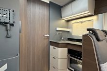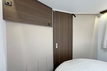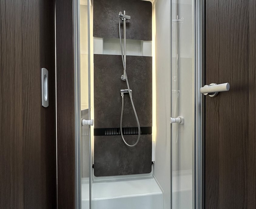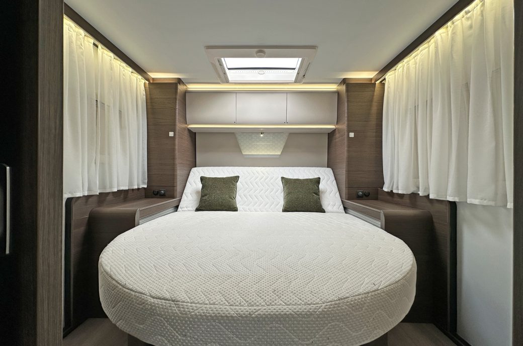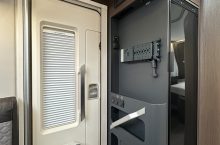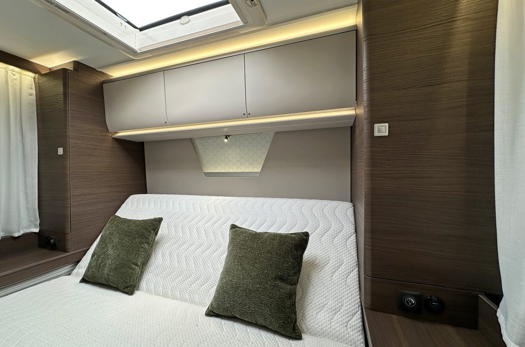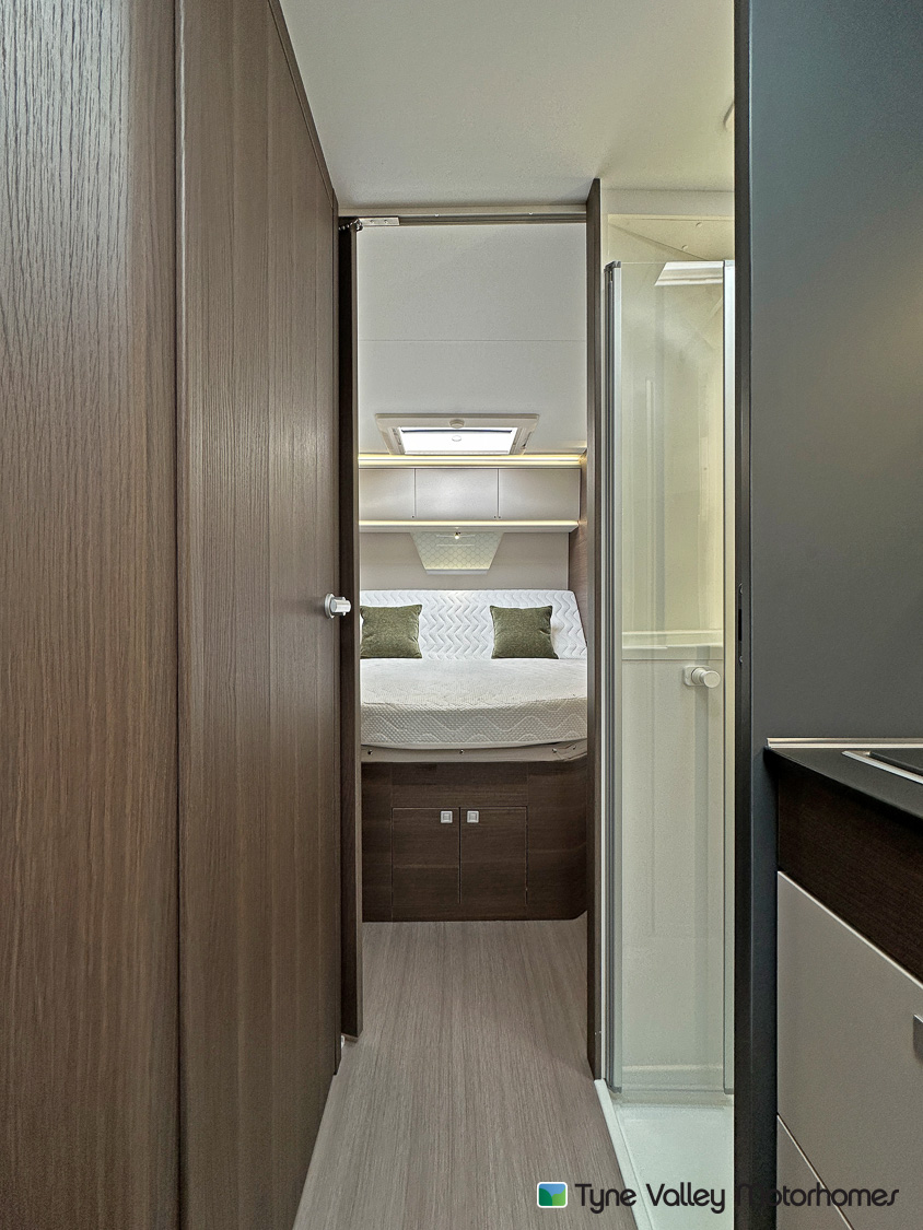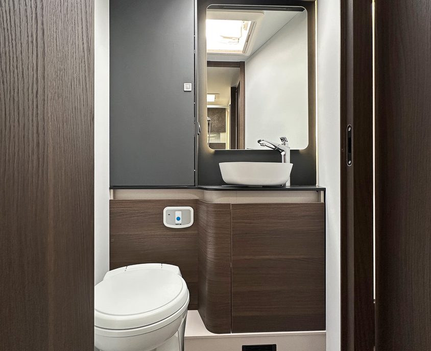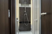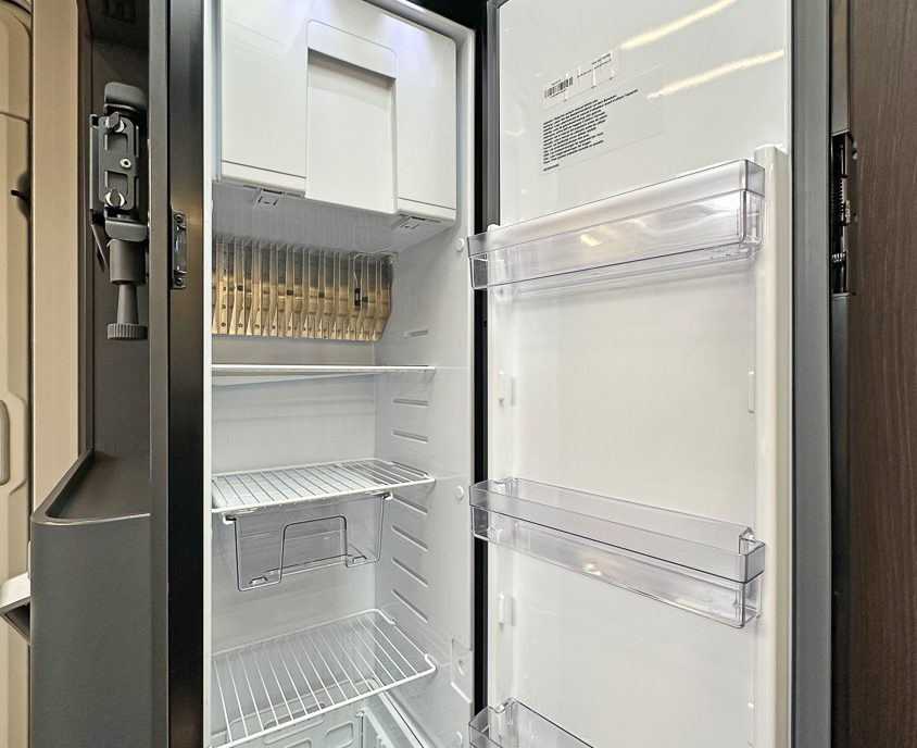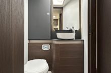 The kitchen in this motorhome is a chef’s dream, boasting a 3-burner gas hob, an oven with grill, a sink, and a large fridge with freezer compartment—all you need to whip up gourmet meals on the go. Head towards the back, and you’ll find a private en-suite washroom complete with a separate shower cubicle. Close off the area entirely with a sliding door, creating a personal sanctuary that separates the washroom from the bedroom.