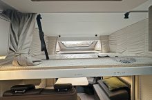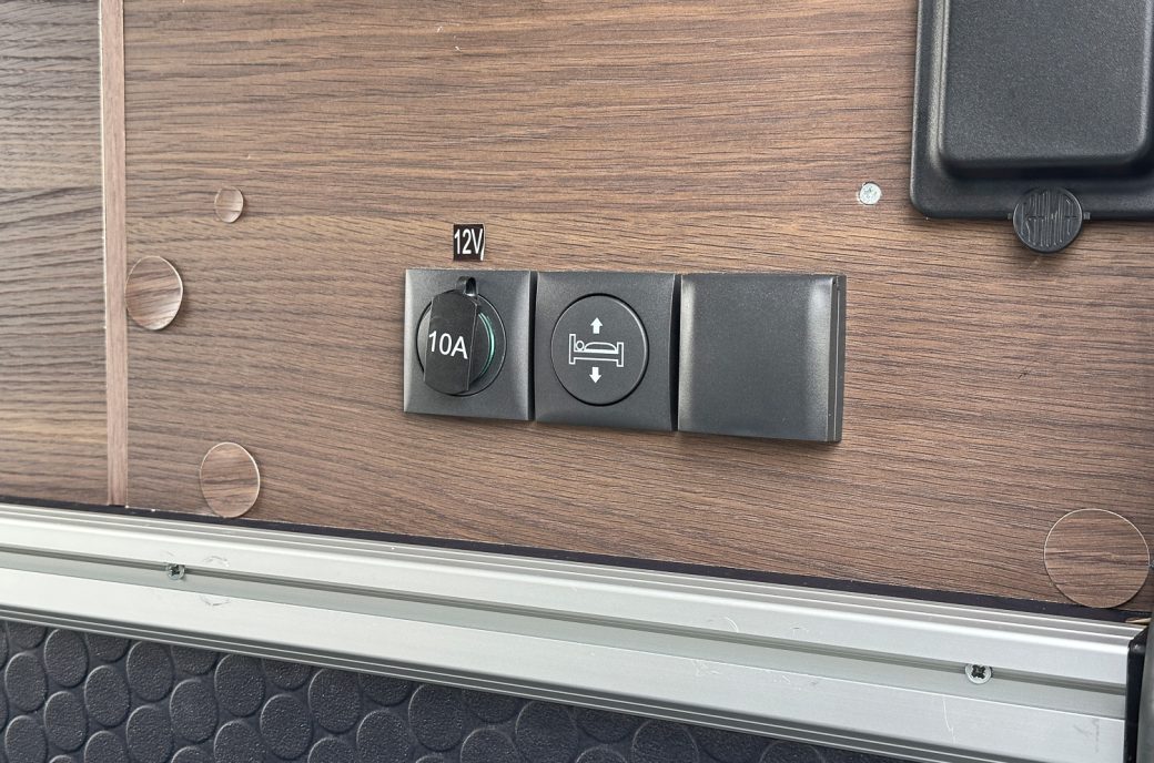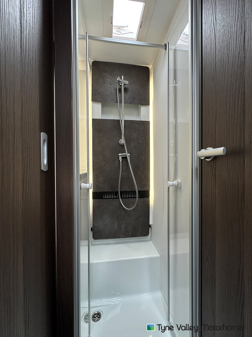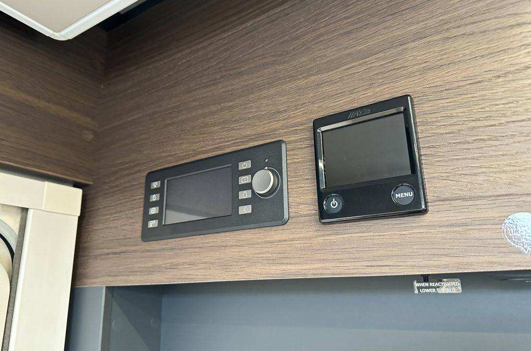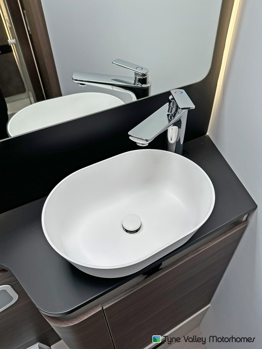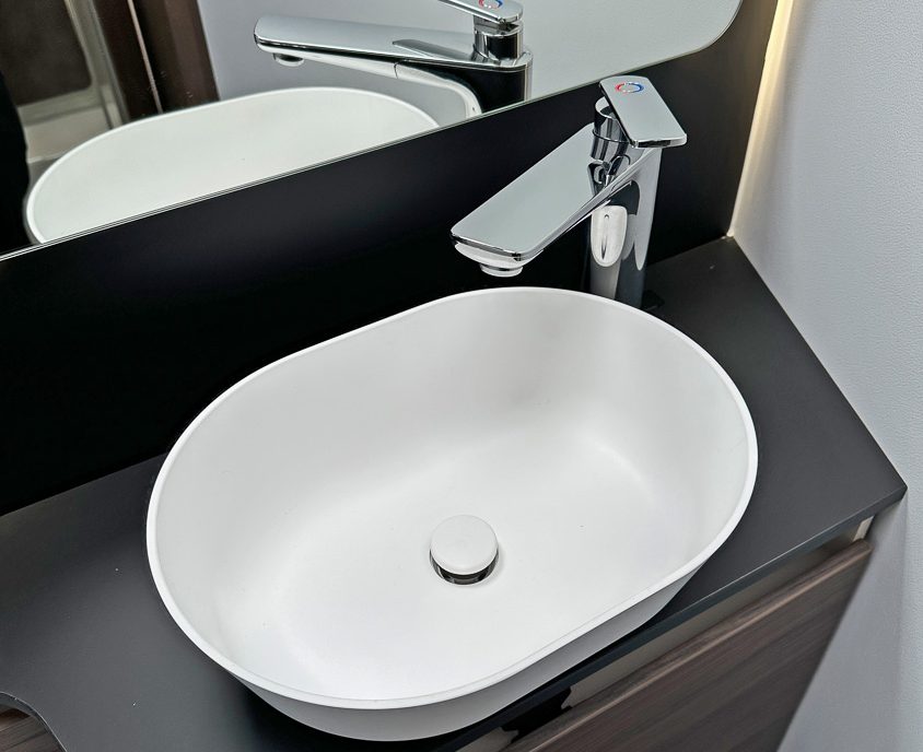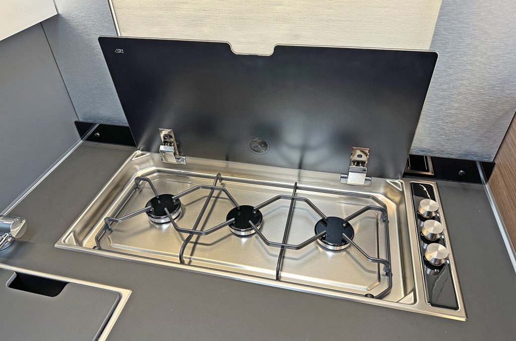 The kitchen in this motorhome is a chef’s dream, boasting a 3-burner gas hob, an oven with grill, a sink, and a large fridge with freezer compartment—all you need to whip up gourmet meals on the go. Head towards the back, and you’ll find a private en-suite washroom complete with a separate shower cubicle. Close off the area entirely with a sliding door, creating a personal sanctuary that separates the washroom from the bedroom.