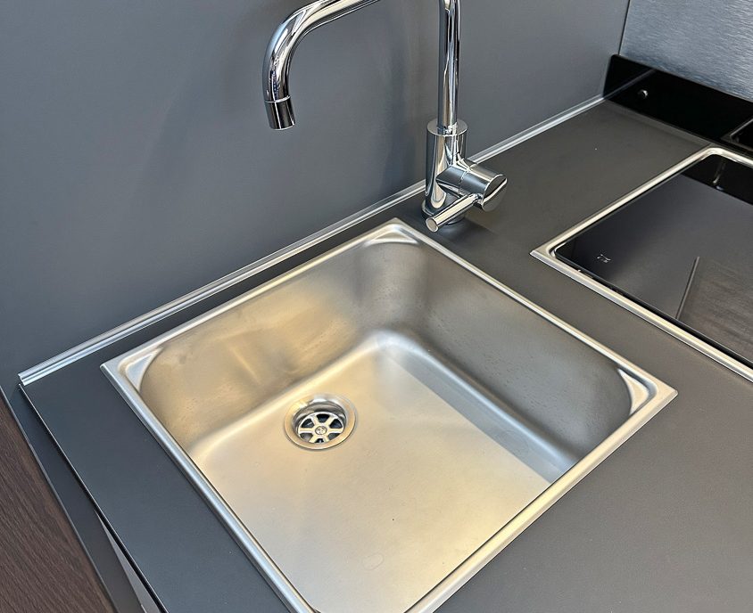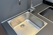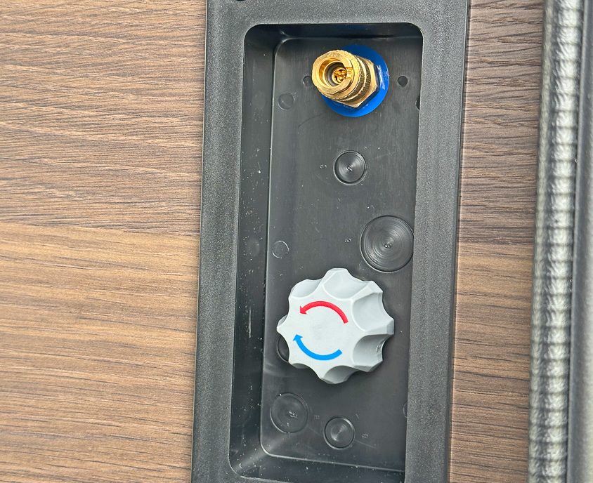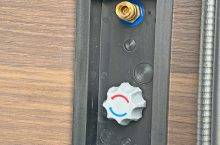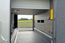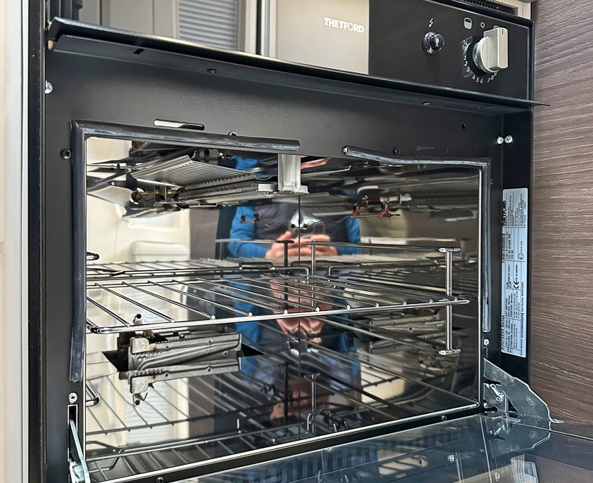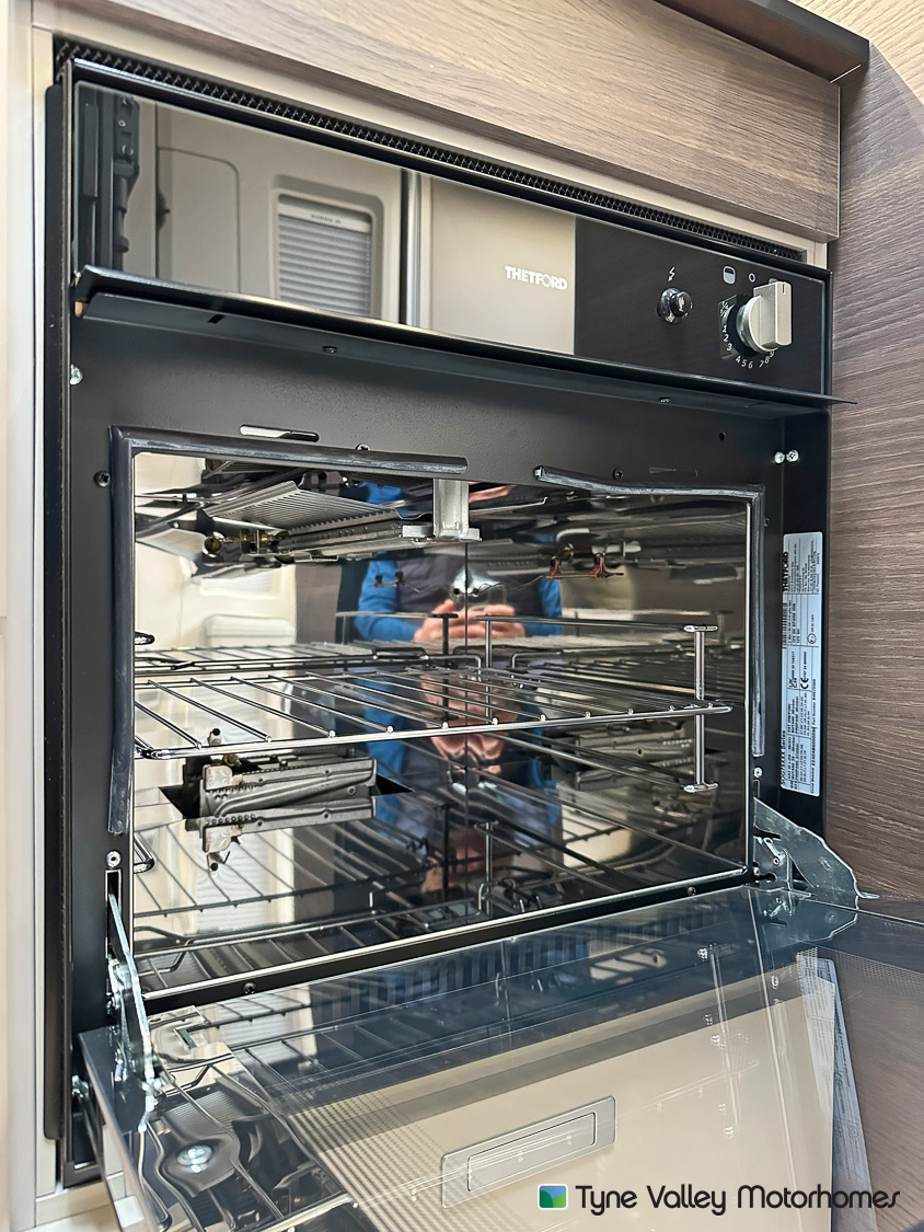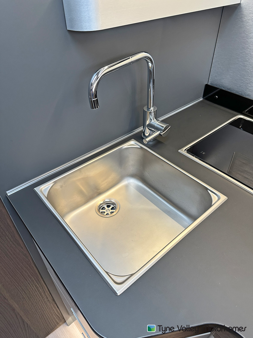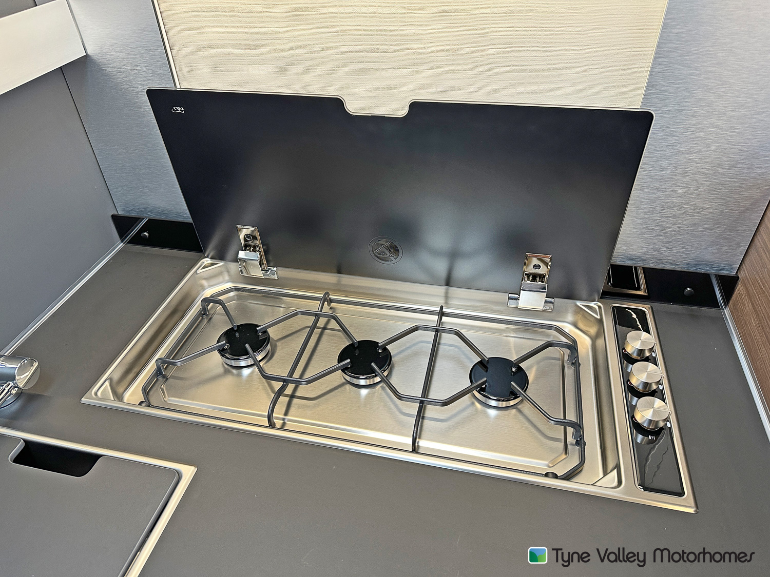 The kitchen in this motorhome is a chef’s dream, boasting a 3-burner gas hob, an oven with grill, a sink, and a large fridge with freezer compartment—all you need to whip up gourmet meals on the go. Head towards the back, and you’ll find a private en-suite washroom complete with a separate shower cubicle. Close off the area entirely with a sliding door, creating a personal sanctuary that separates the washroom from the bedroom.