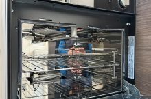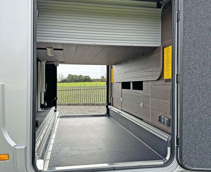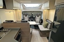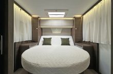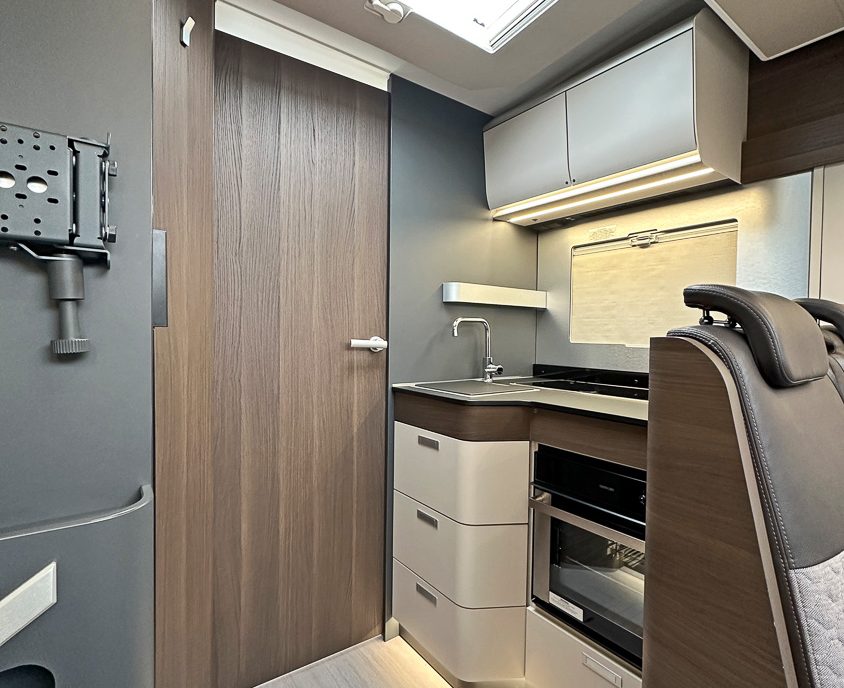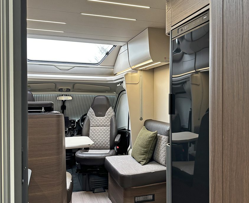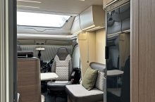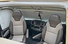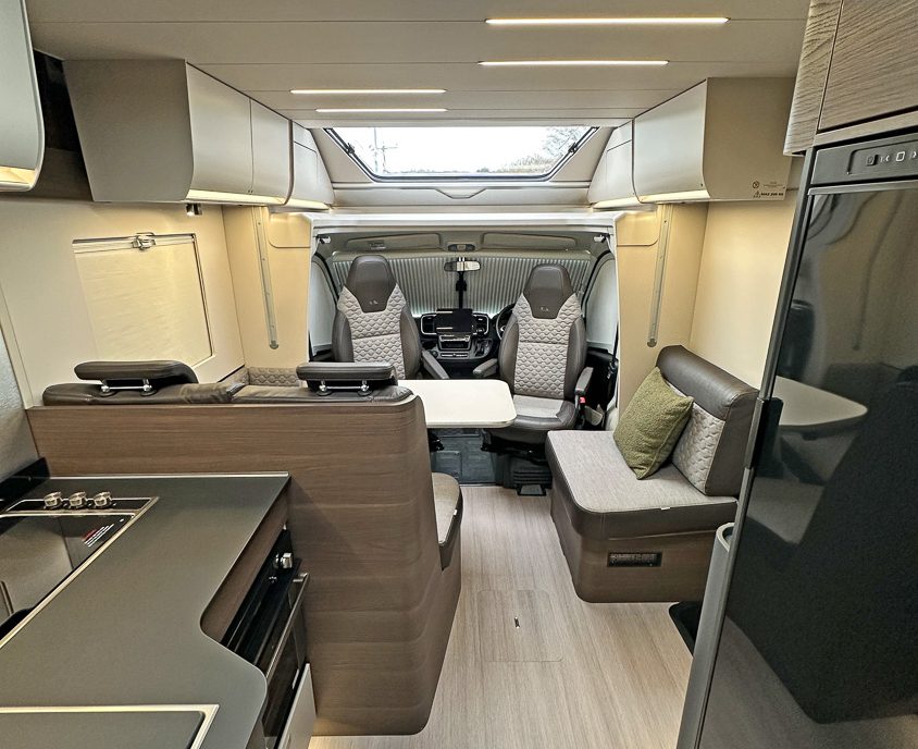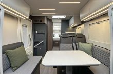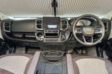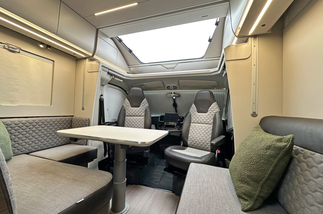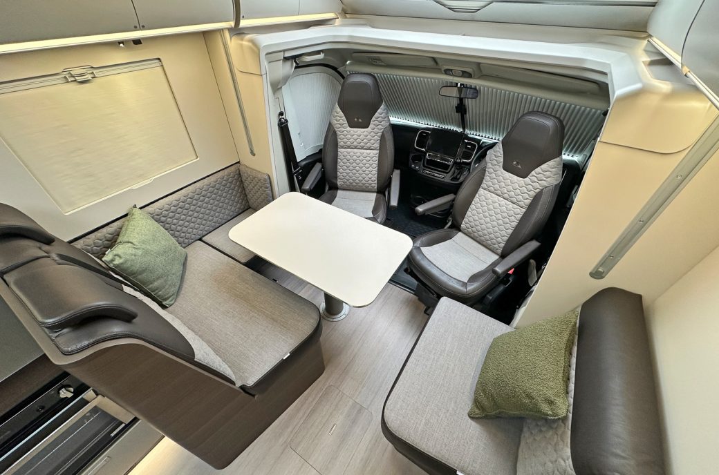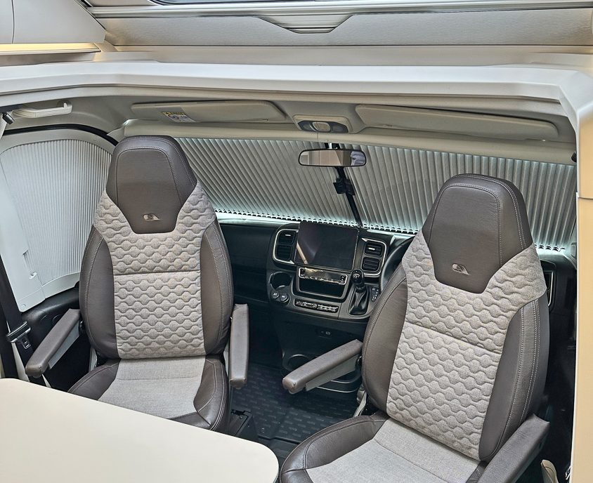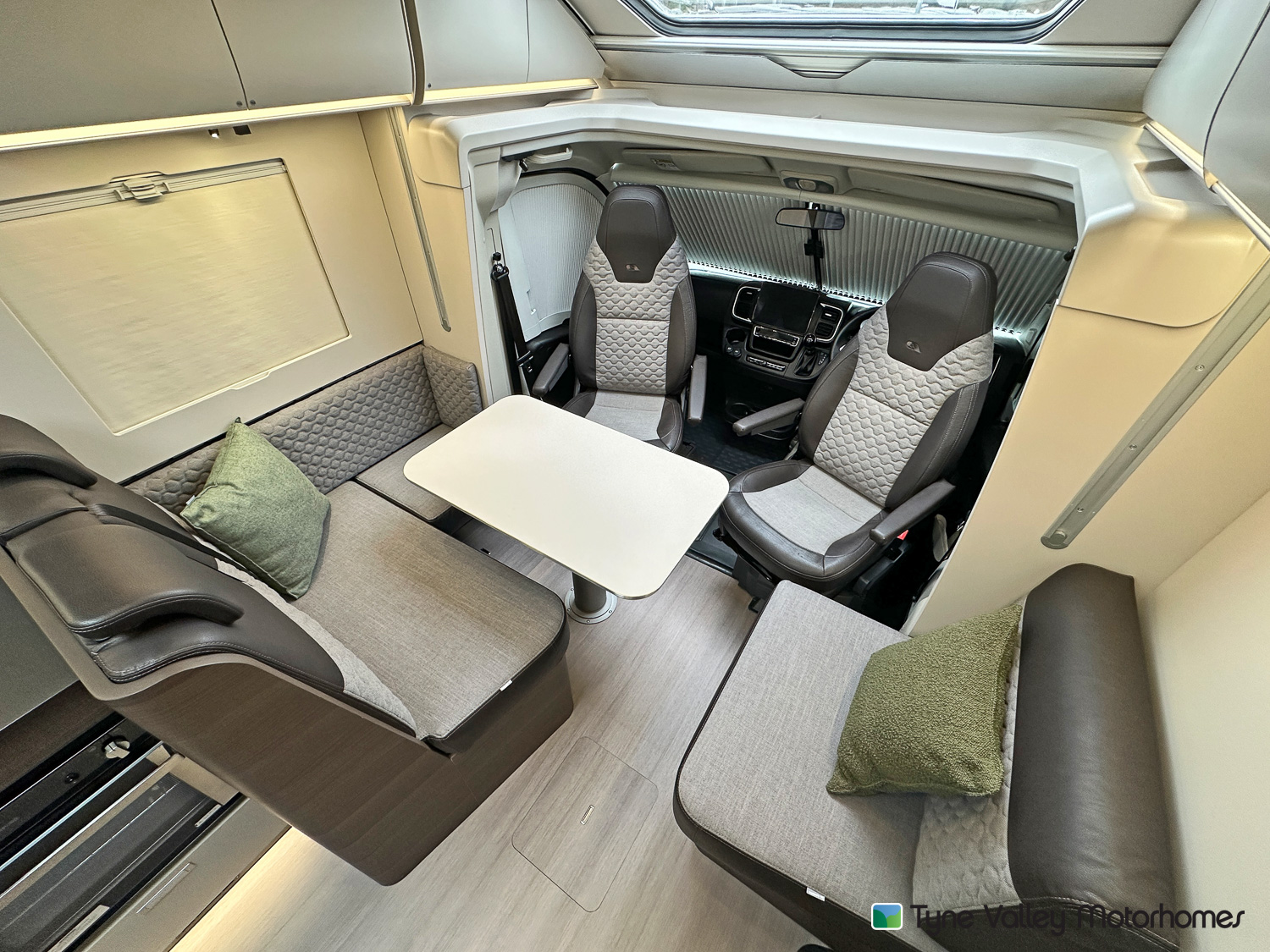 Step inside, and you’ll be welcomed by a spacious, luxury front L-shaped lounge/dinette incorporating 3 extra traveling seats. At night, an electrically operated drop-down double bed descends seamlessly from above, offering convenient and cozy sleeping arrangements.