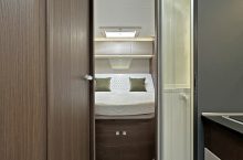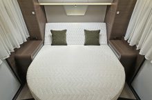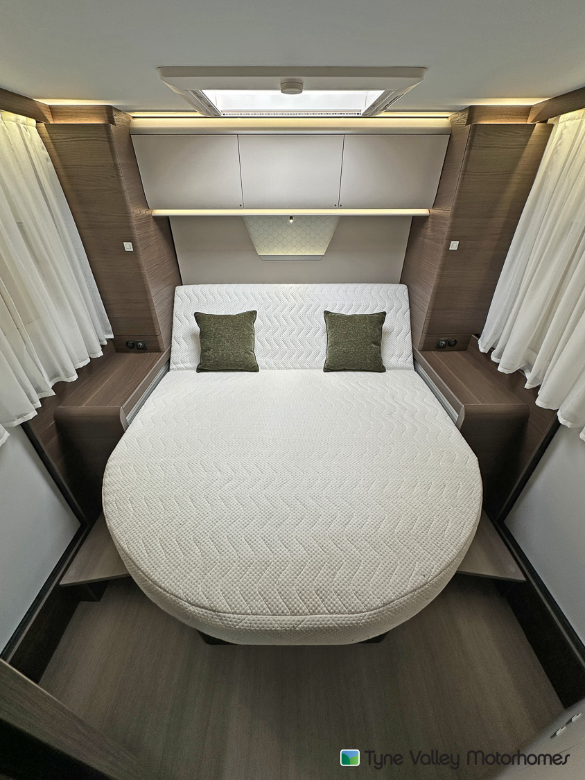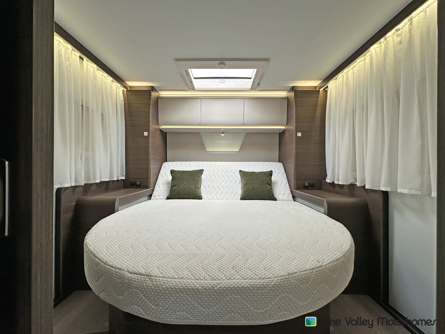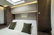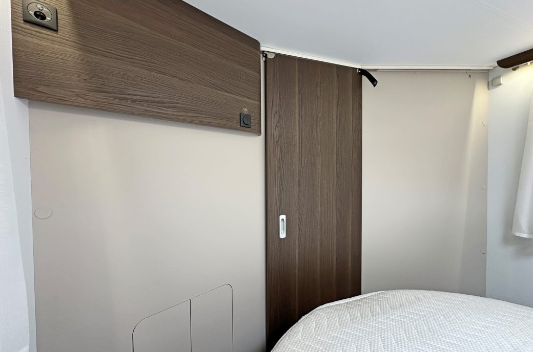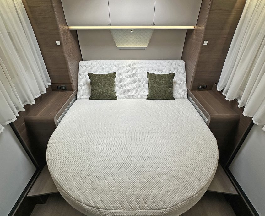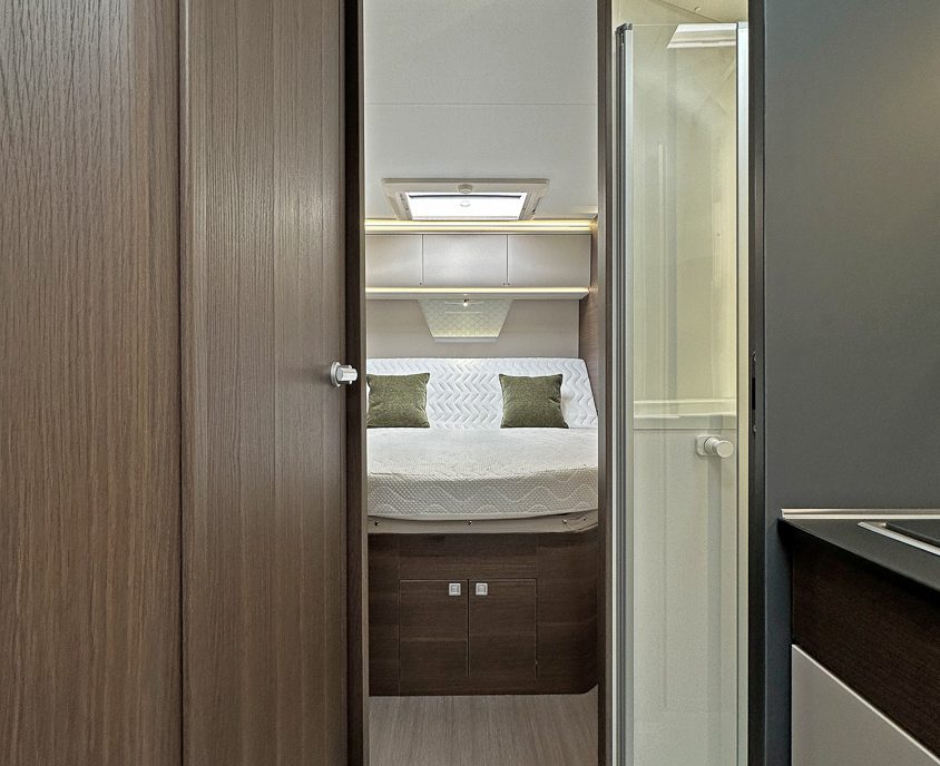 In the rear bedroom, enjoy the comfort of a retractable island bed that optimizes your space during the day and pulls out to deliver a relaxing night’s sleep. With overhead storage, his and hers wardrobes, and ample room to relax, it’s a true home away from home.