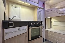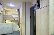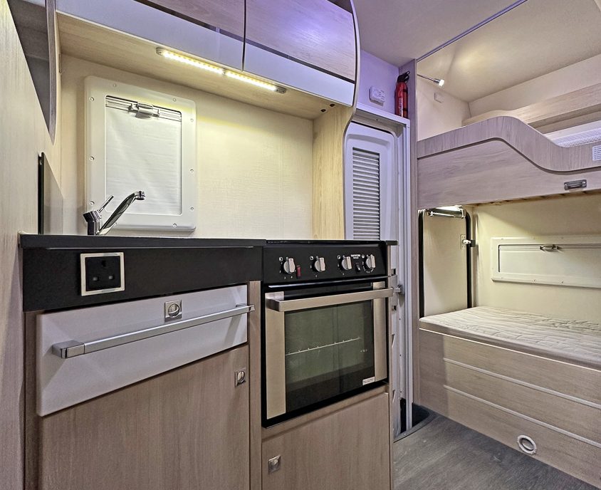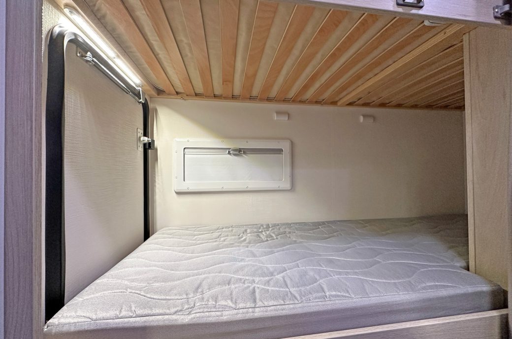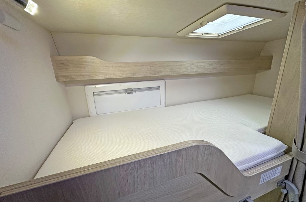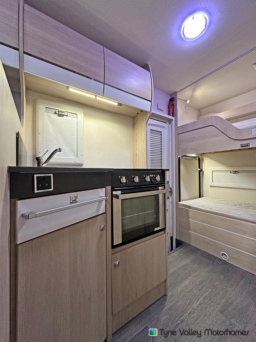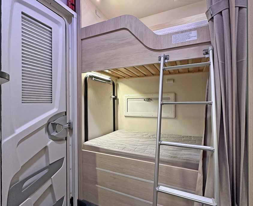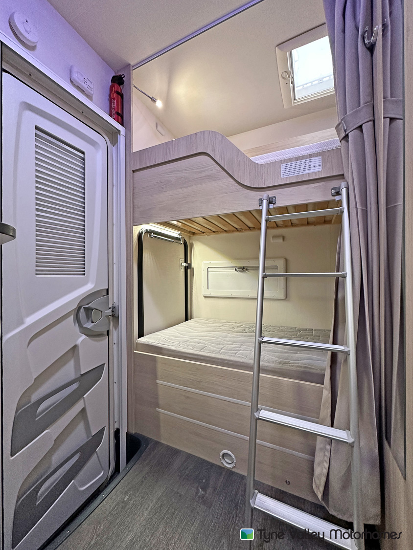it ideal for larger families. It features twin rear bunks, with the lower bunk folding away to create a versatile garage space, and