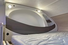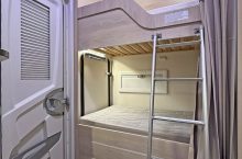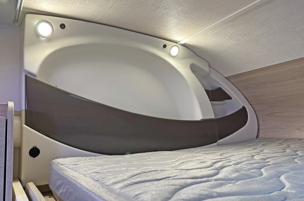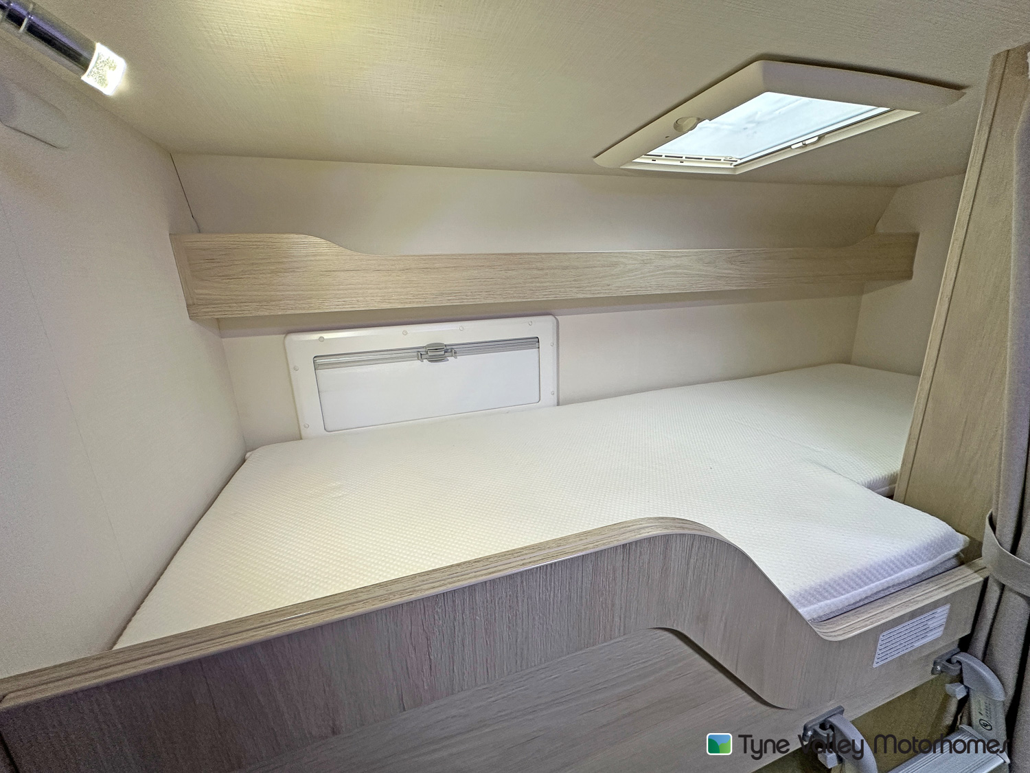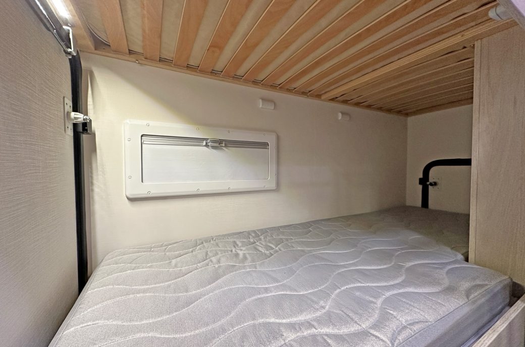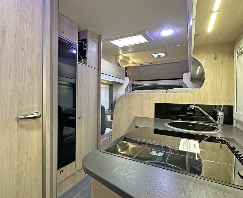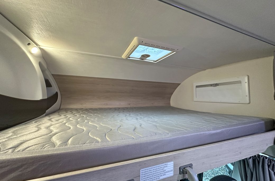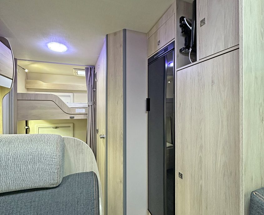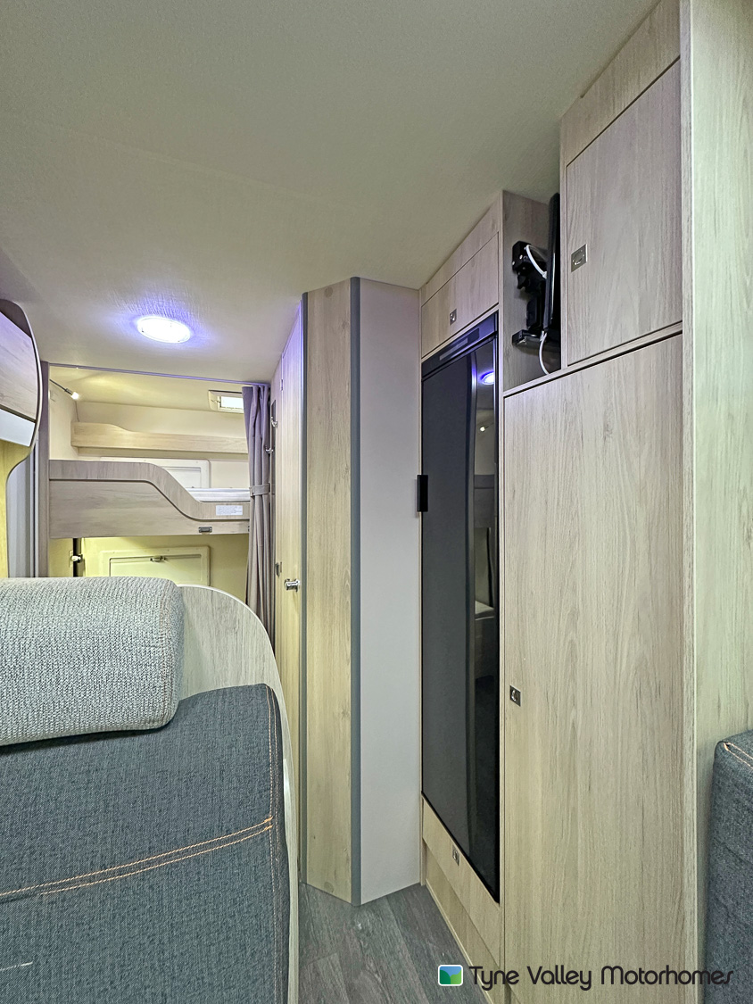 it ideal for larger families. It features twin rear bunks, with the lower bunk folding away to create a versatile garage space, and