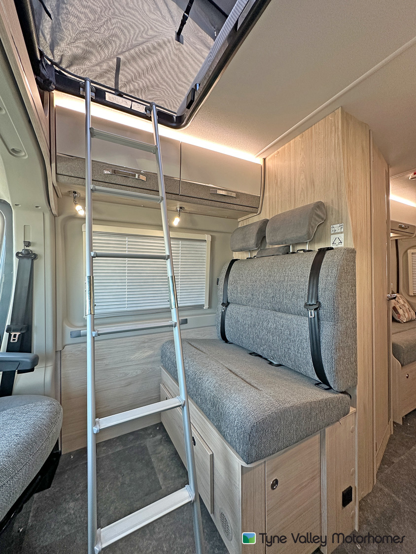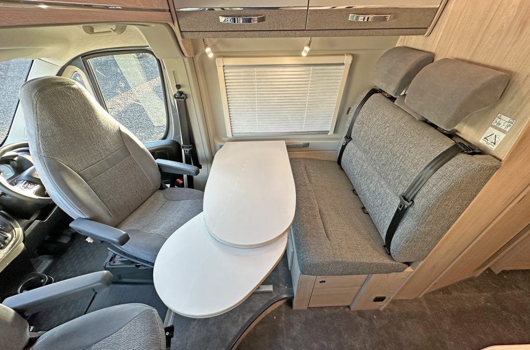 The central kitchen is fully equipped for extended touring, featuring a 3-burner gas hob , a combination oven and grill, stainless steel sink with matching cover and a slim, stylish fridge/freezer. Opposite the kitchen sits the well-appointed washroom with toilet, basin, and shower, enhanced with modern, practical finishing touches.