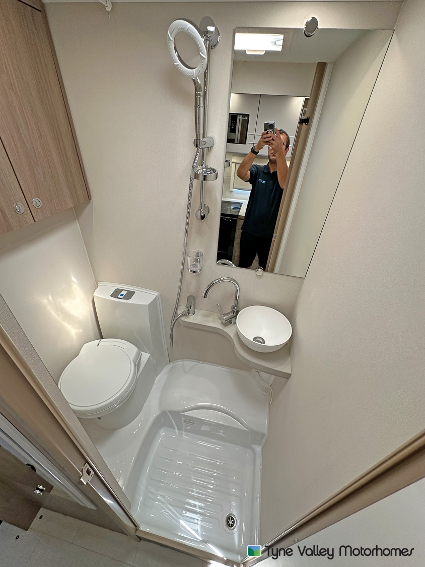 Cooking on the road has never been easier, thanks to the fully equipped kitchen. Featuring a 3-burner gas hob, 240V hotplate, grill, full oven, microwave oven, and a 3-way fridge/freezer, you have everything you need to prepare delicious meals, whether you’re parked up in a scenic campsite or off-grid in the wilderness. Opposite the kitchen, the well-designed washroom with toilet, shower, and sink providing refreshing convenience wherever you park up.