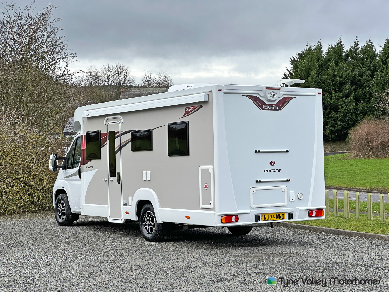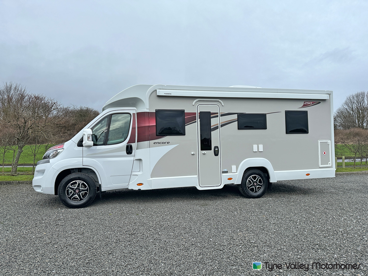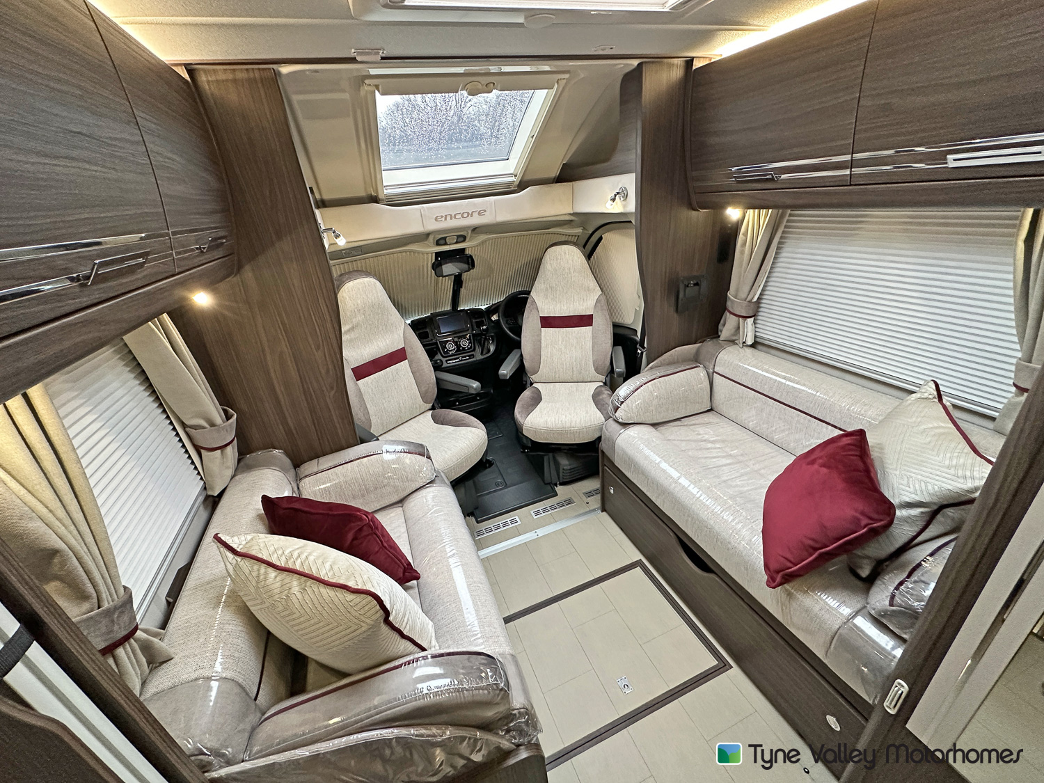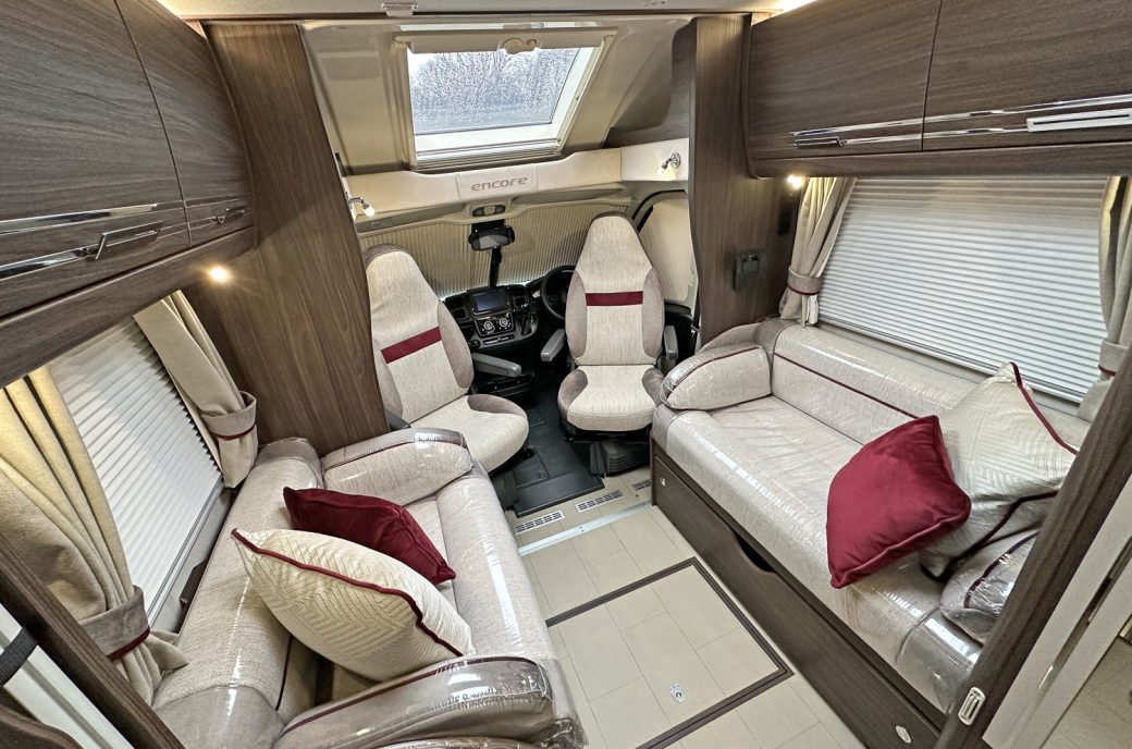 This 2024 model Elddis Encore is based on a Fiat Ducato chassis with a 2.2 L 140 BHP engine paired to an automatic gearbox. This motorhome perfectly combines stylish design, innovative features and practical living space.