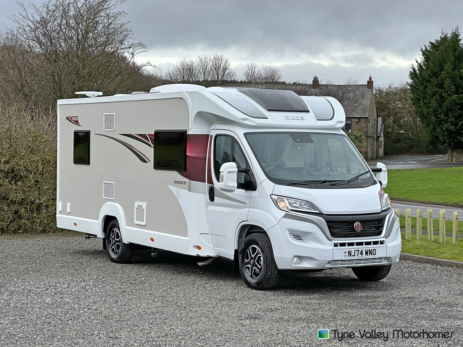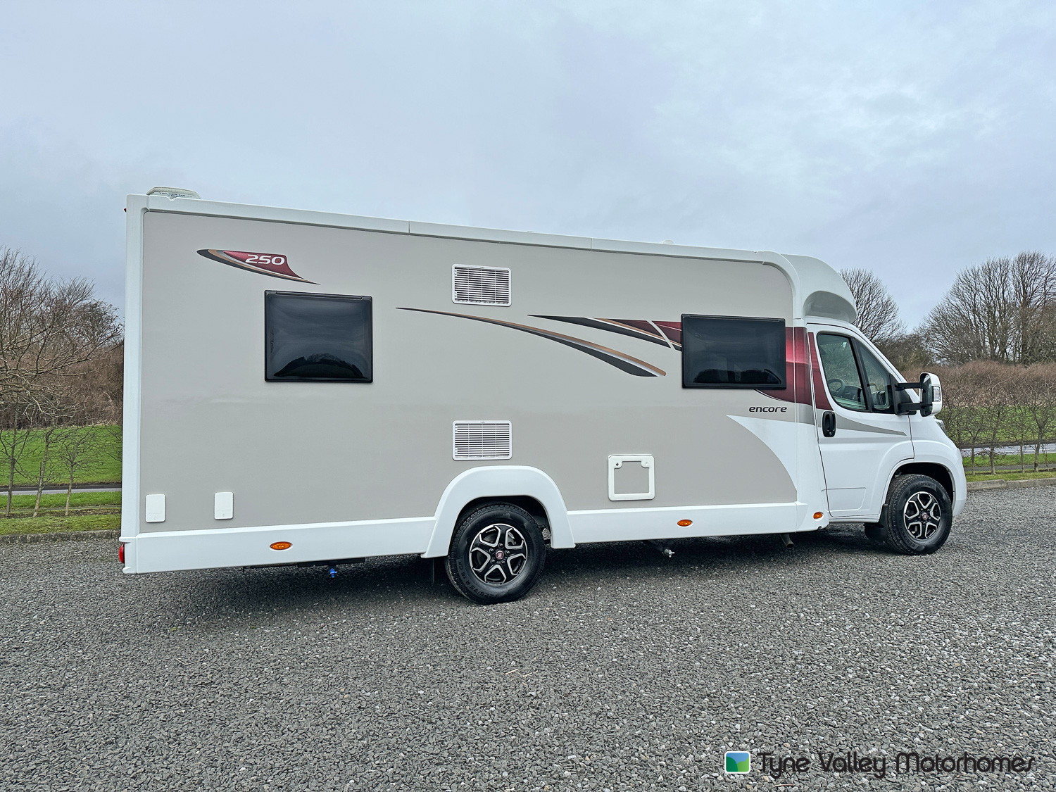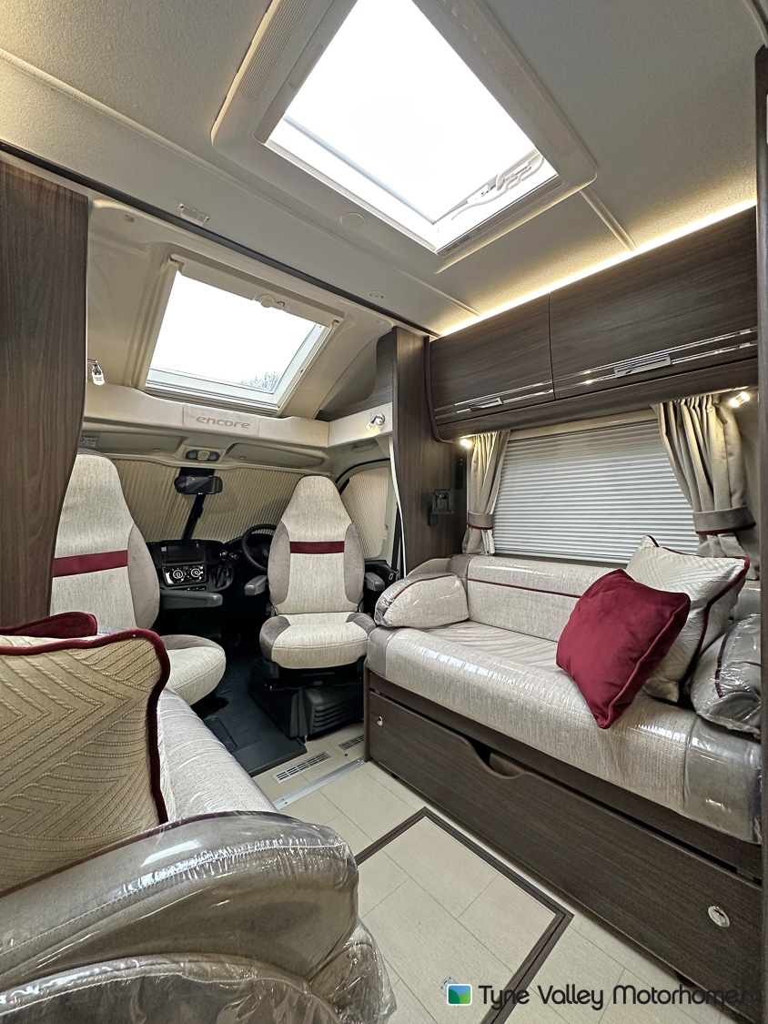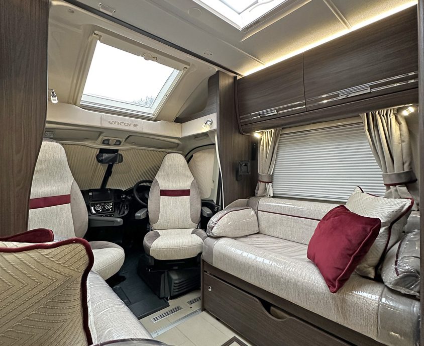 This 2024 model Elddis Encore is based on a Fiat Ducato chassis with a 2.2 L 140 BHP engine paired to an automatic gearbox. This motorhome perfectly combines stylish design, innovative features and practical living space.