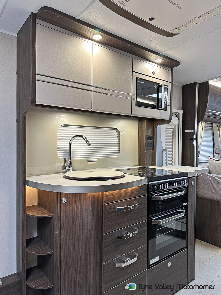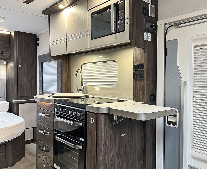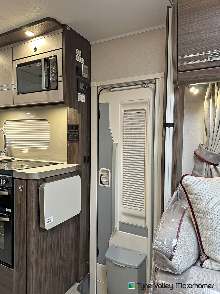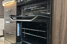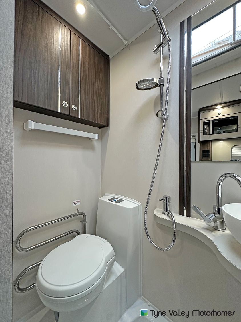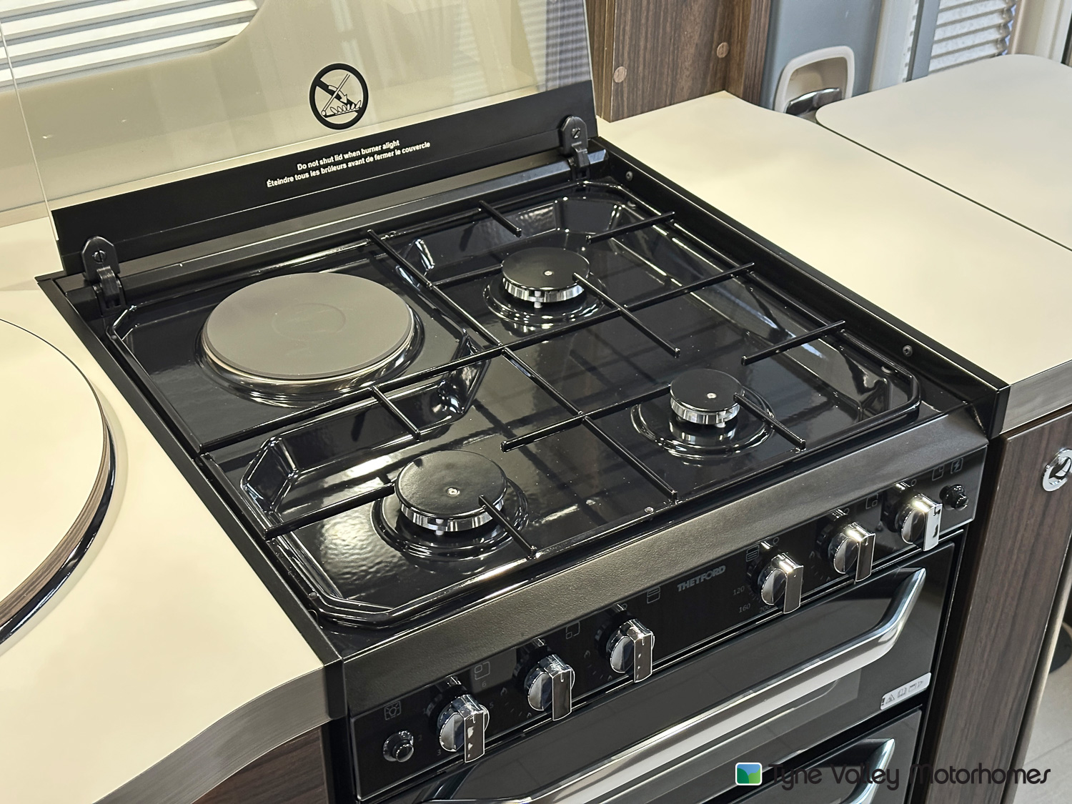 At the heart of this Encore 250 motorhome is a fully equipped kitchen designed to meet the needs of even the most enthusiastic holiday chef. The central kitchen features a four-burner hob (3 gas,1 electric), grill, full oven, microwave oven and a tall fridge/freezer, providing everything needed to prepare meals on the road. Opposite the kitchen is the washroom, which has been cleverly designed to offer maximum practicality within a compact space. It includes a stylish washbasin and cassette toilet, and with the help of a wraparound curtain, the area transforms into a functional shower cubicle, giving you the convenience of home wherever you are.