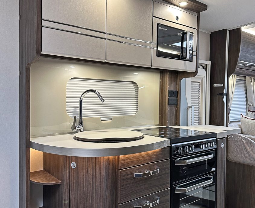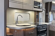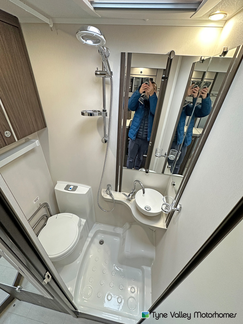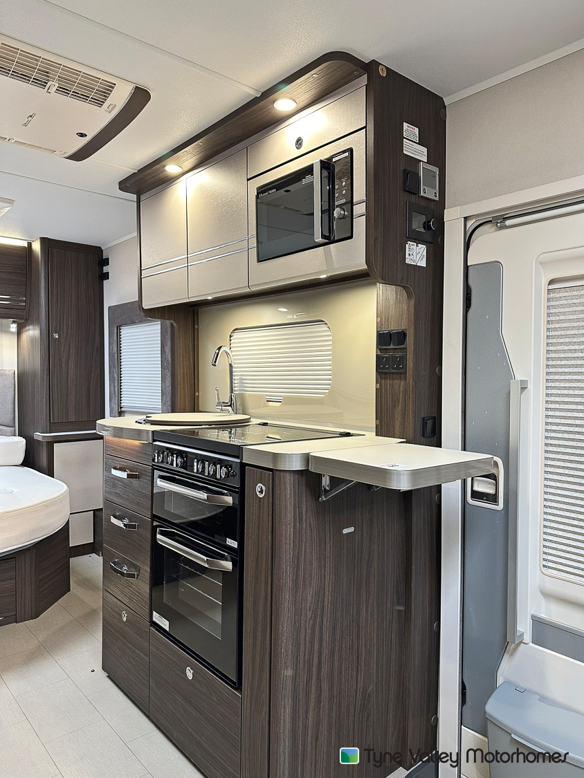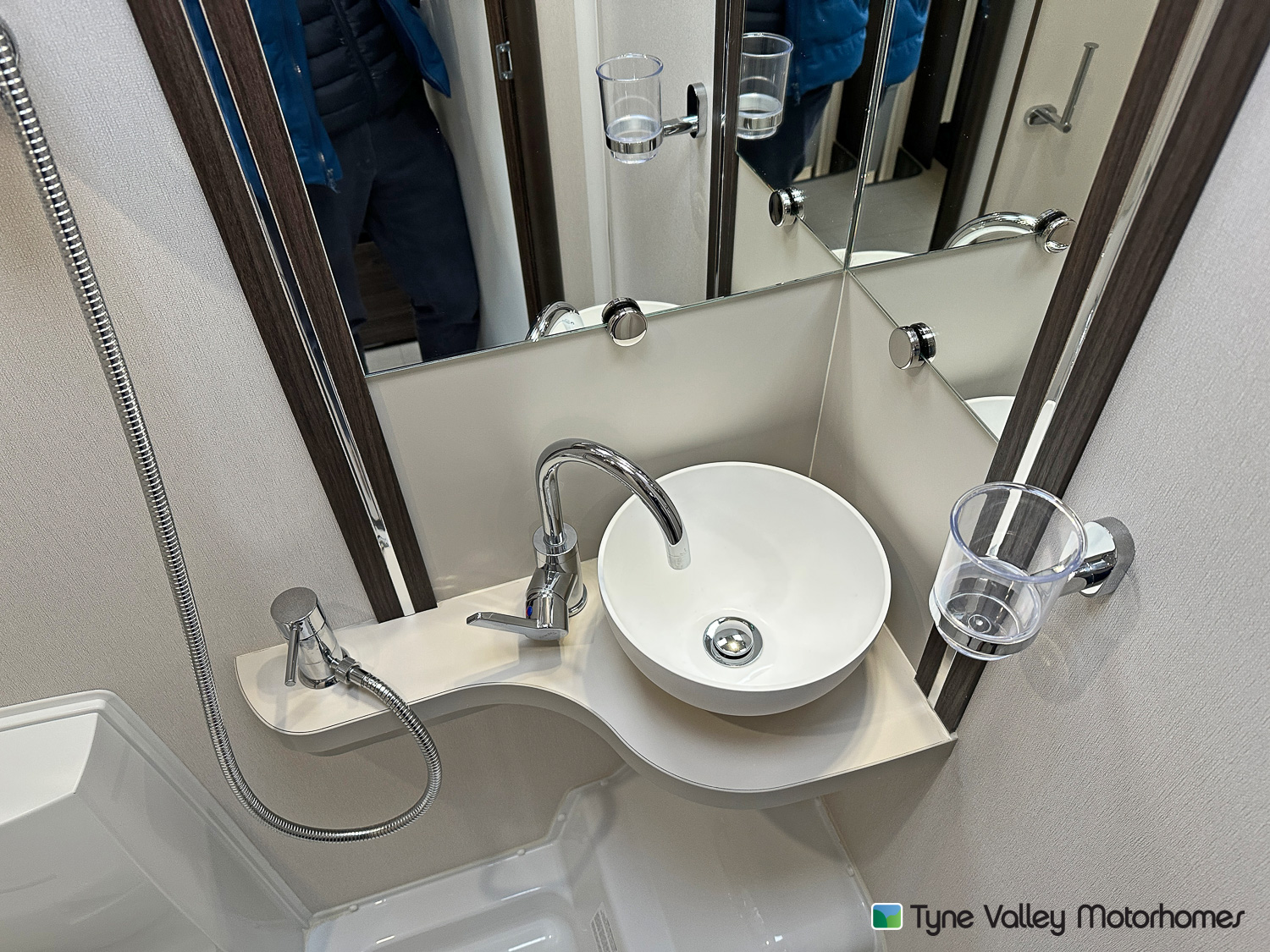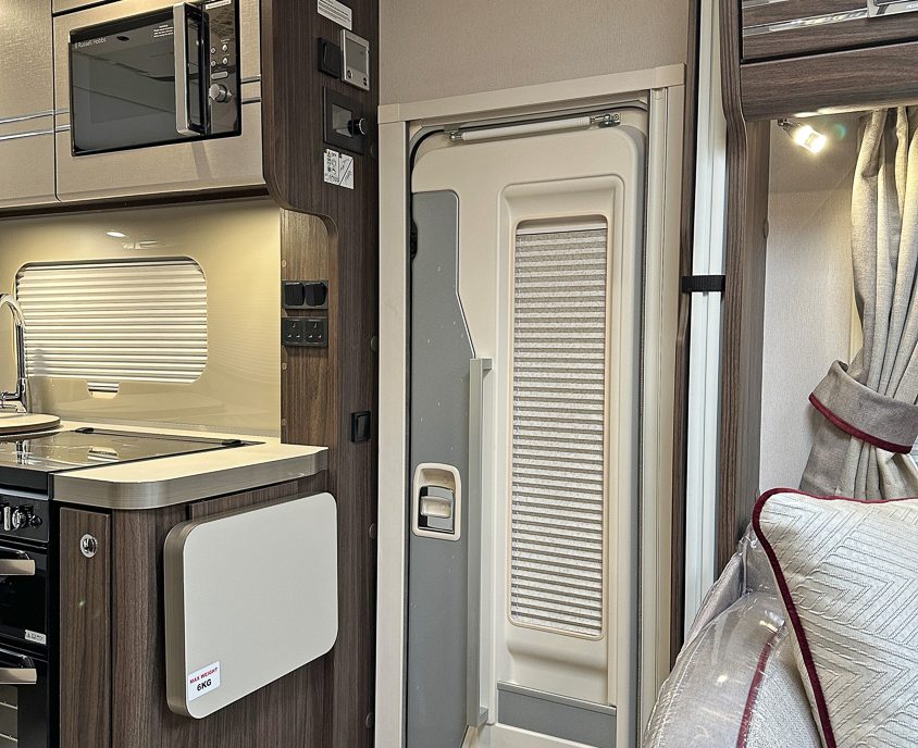 At the heart of this Encore 250 motorhome is a fully equipped kitchen designed to meet the needs of even the most enthusiastic holiday chef. The central kitchen features a four-burner hob (3 gas,1 electric), grill, full oven, microwave oven and a tall fridge/freezer, providing everything needed to prepare meals on the road. Opposite the kitchen is the washroom, which has been cleverly designed to offer maximum practicality within a compact space. It includes a stylish washbasin and cassette toilet, and with the help of a wraparound curtain, the area transforms into a functional shower cubicle, giving you the convenience of home wherever you are.