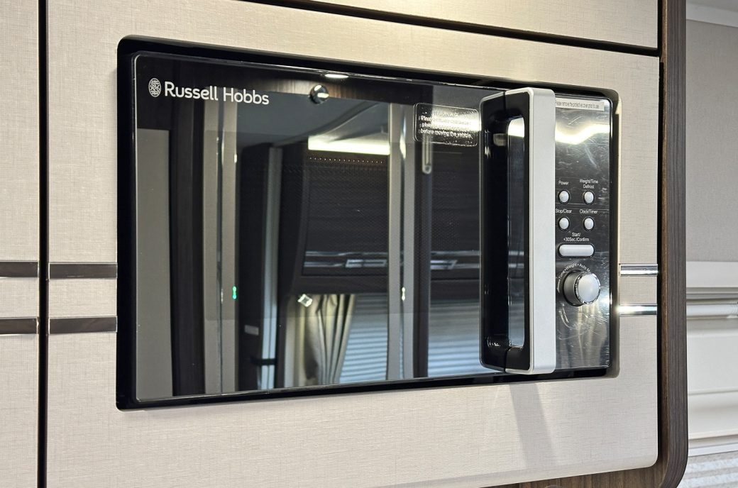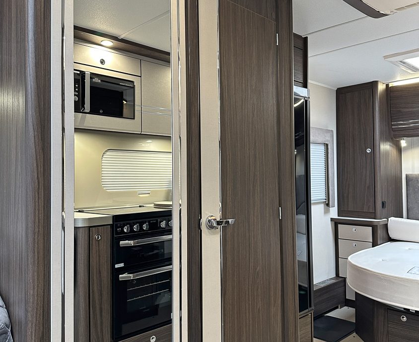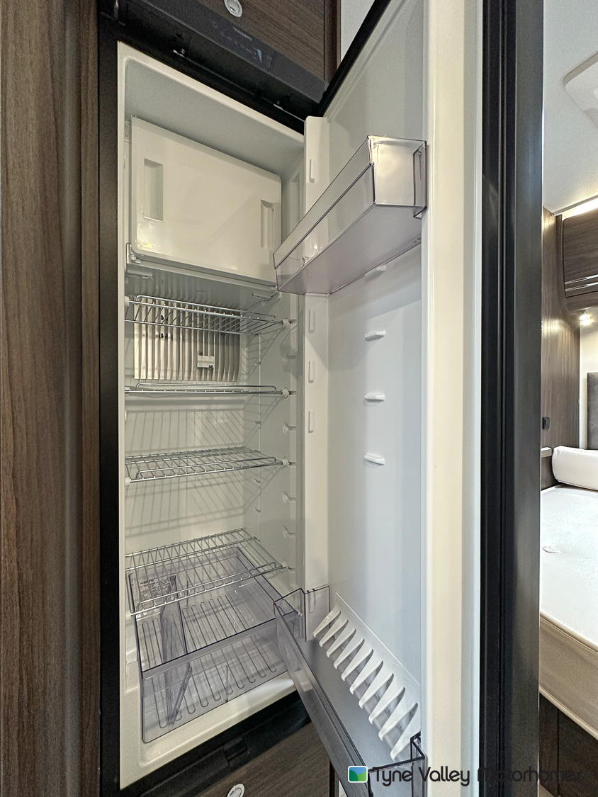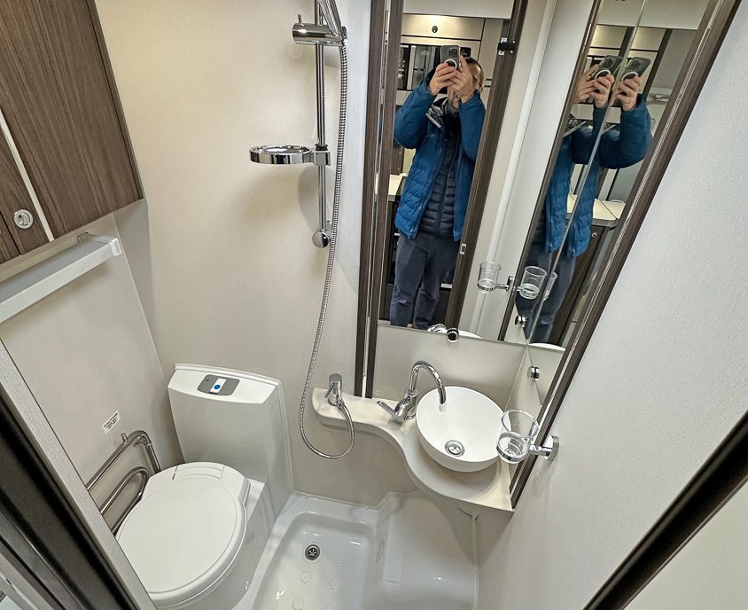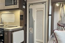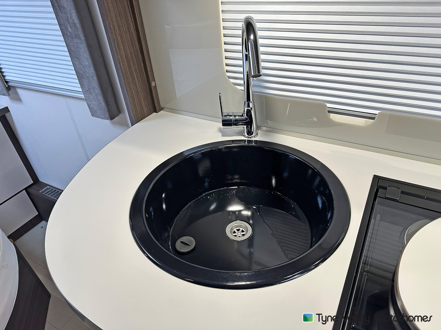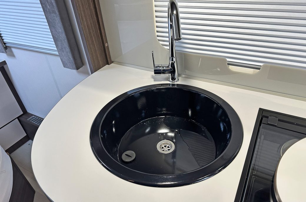 At the heart of this Encore 250 motorhome is a fully equipped kitchen designed to meet the needs of even the most enthusiastic holiday chef. The central kitchen features a four-burner hob (3 gas,1 electric), grill, full oven, microwave oven and a tall fridge/freezer, providing everything needed to prepare meals on the road. Opposite the kitchen is the washroom, which has been cleverly designed to offer maximum practicality within a compact space. It includes a stylish washbasin and cassette toilet, and with the help of a wraparound curtain, the area transforms into a functional shower cubicle, giving you the convenience of home wherever you are.