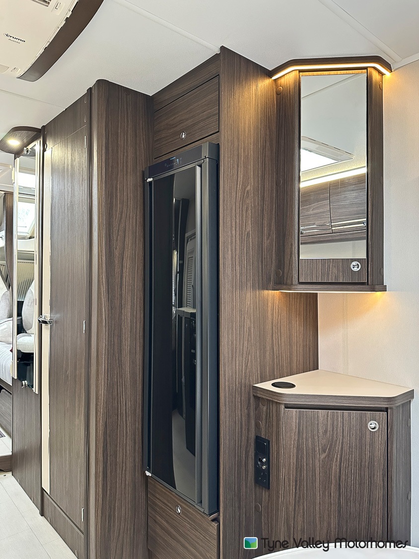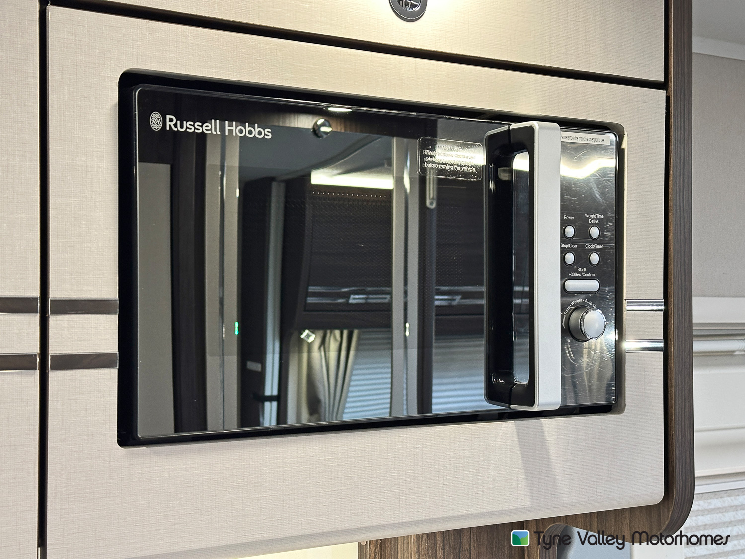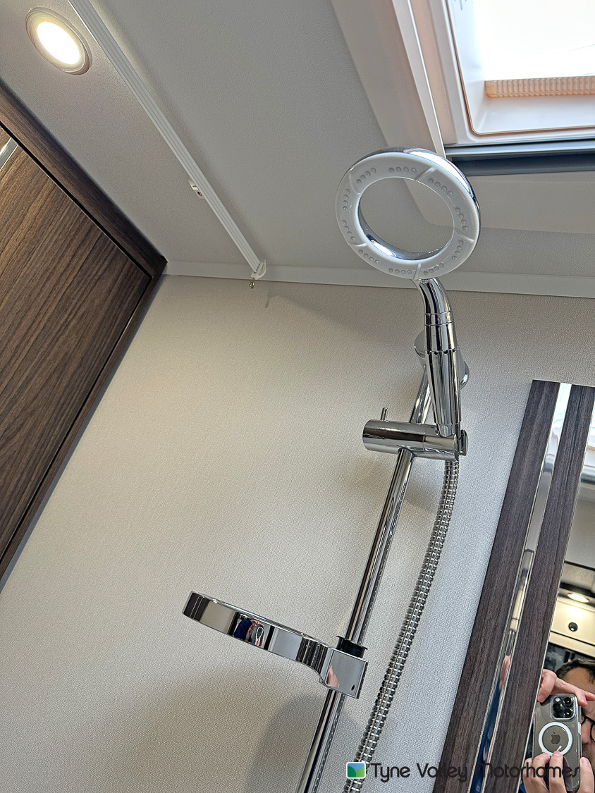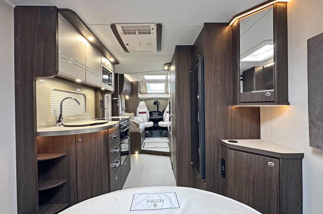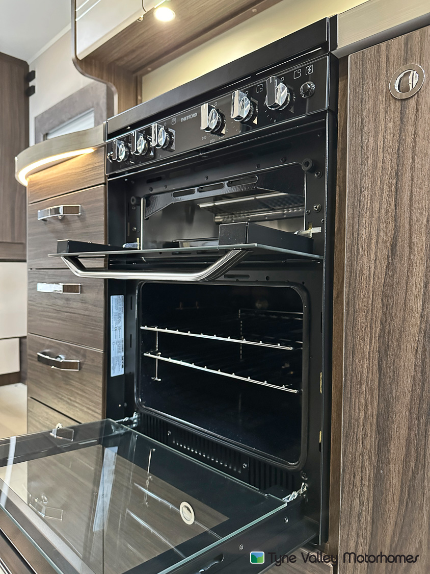 At the heart of this Encore 250 motorhome is a fully equipped kitchen designed to meet the needs of even the most enthusiastic holiday chef. The central kitchen features a four-burner hob (3 gas,1 electric), grill, full oven, microwave oven and a tall fridge/freezer, providing everything needed to prepare meals on the road. Opposite the kitchen is the washroom, which has been cleverly designed to offer maximum practicality within a compact space. It includes a stylish washbasin and cassette toilet, and with the help of a wraparound curtain, the area transforms into a functional shower cubicle, giving you the convenience of home wherever you are.