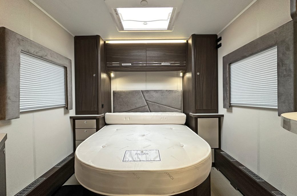 At the rear of the motorhome is the standout feature: the island bed. This design offers both comfort and versatility. During the day, the bed can be retracted to create extra living space, while at night it extends into a generous, cosy bed that ensures a restful night’s sleep. This thoughtful arrangement makes the rear bedroom a private retreat, perfect for unwinding at the end of a busy day.