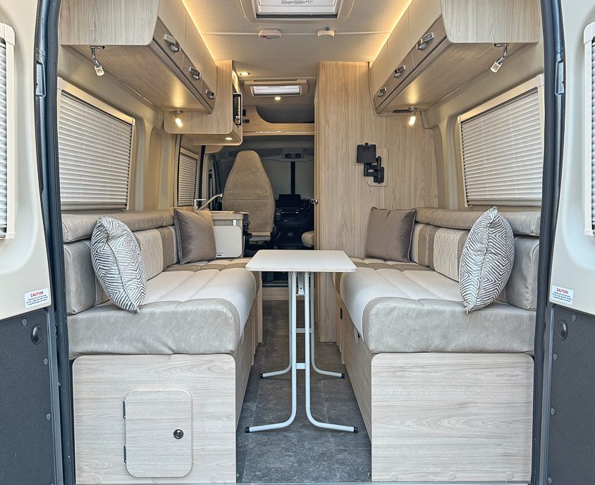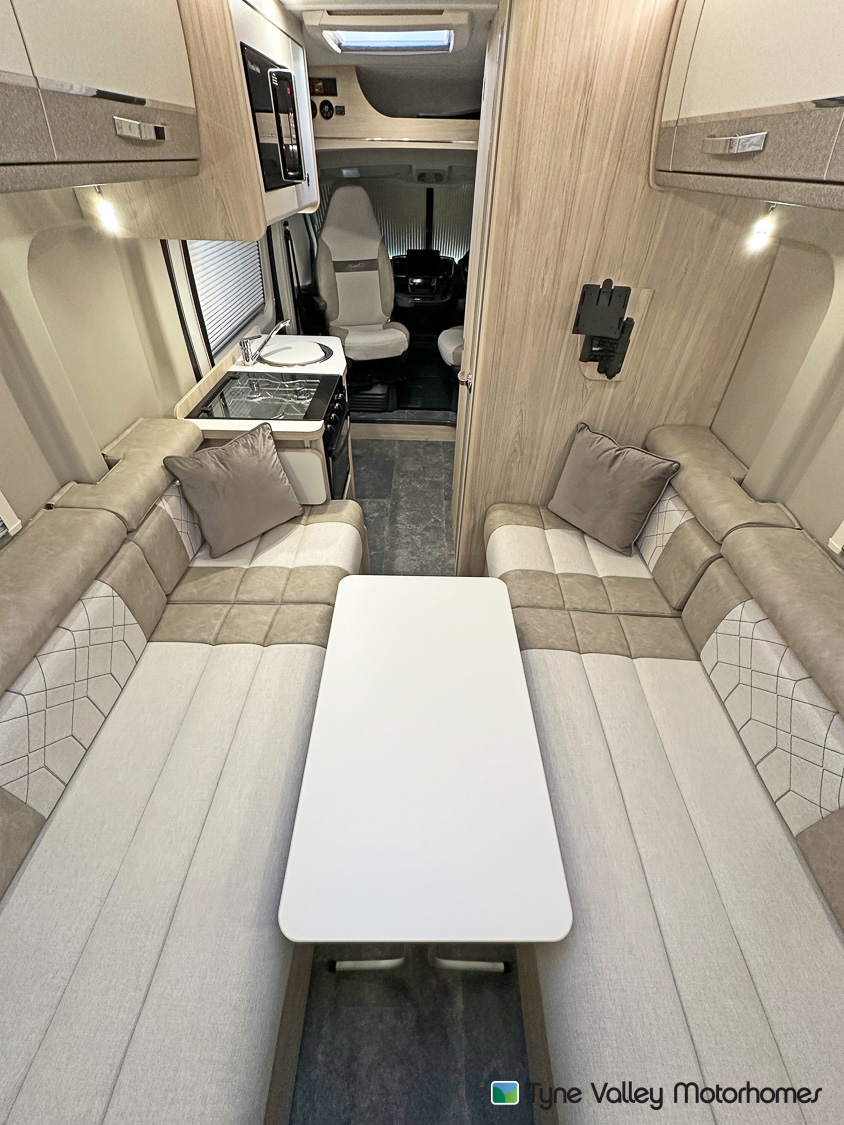Inside, the CV20 is a premium 2 berth van conversion created exclusively for Tyne Valley Motorhomes, blending a luxury feel with a practical, well-planned layout. Up front, the driver and passenger seats swivel to create a sociable space, seamlessly linking the cab to the living area so you can relax, dine, or plan the next stop in comfort.