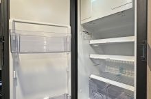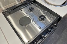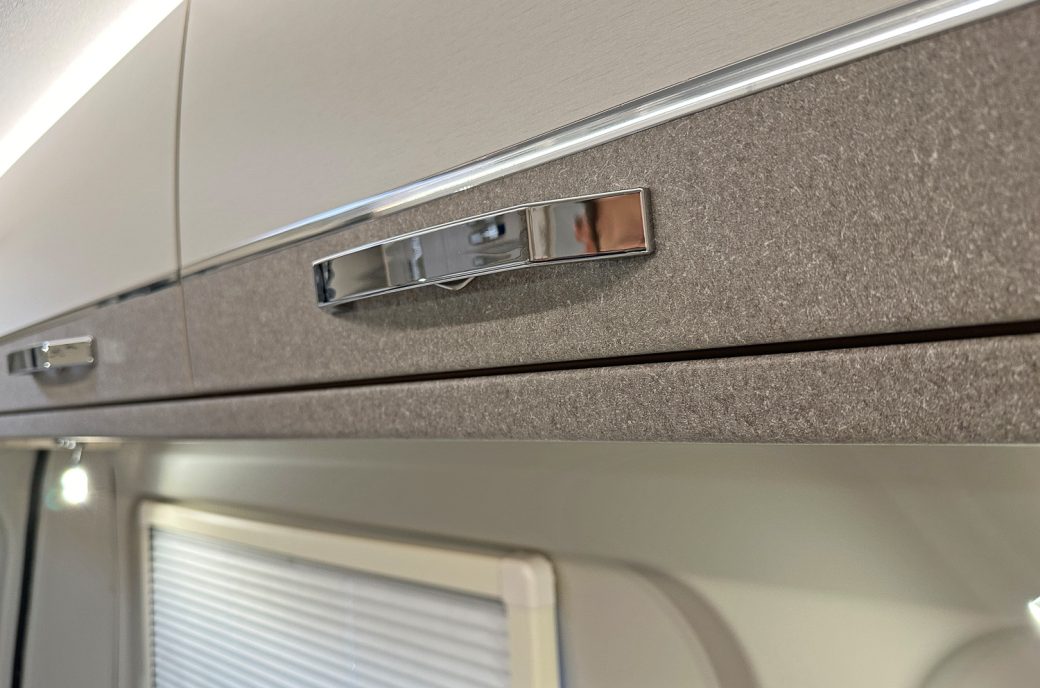 The central kitchen is thoughtfully equipped for proper touring meals, featuring a 2 burner gas hob alongside a 240V hotplate, a combination grill and oven, a stainless steel sink with a matching worktop cover to maximise preparation space, plus a microwave oven and a stylish slimline fridge/freezer to keep everything fresh and well organised. Opposite, you’ll find the highly usable washroom with toilet and shower facilities, finished with smart, contemporary touches that make it feel far more upmarket than you’d expect in a campervan of this size.