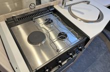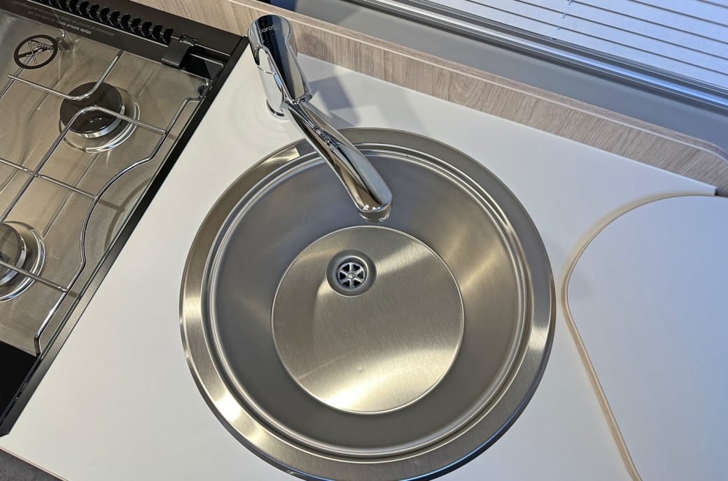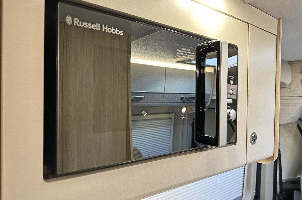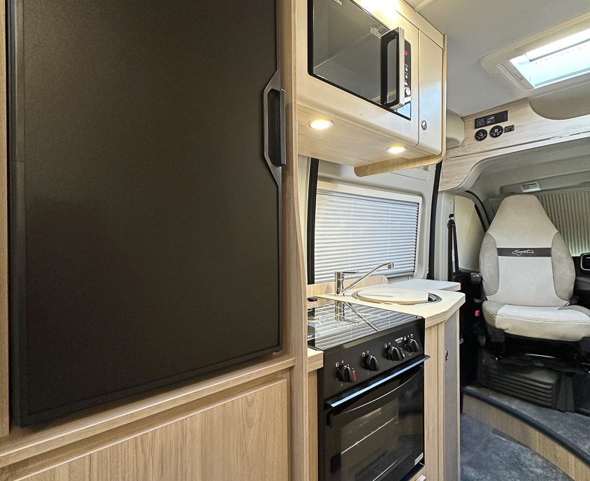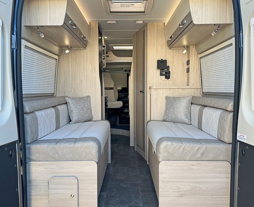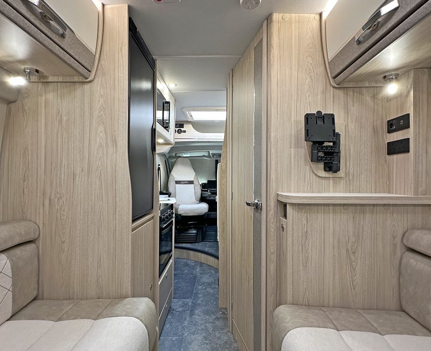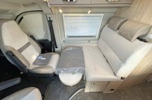 Accommodation comprises of front driver and passenger swivel seats, complimented with a pullman dinette which converts into a 3rd berth. A large rear lounge which converts into a double bed, centre kitchen with a 2 burner gas hob plus 240v hotplate, combination grill/oven, stainless steel sink with matching worktop cover, microwave oven and a stylish, slim fridge/freezer, opposite the kitchen is the very practical wash/wc/shower room with some stylish touches.