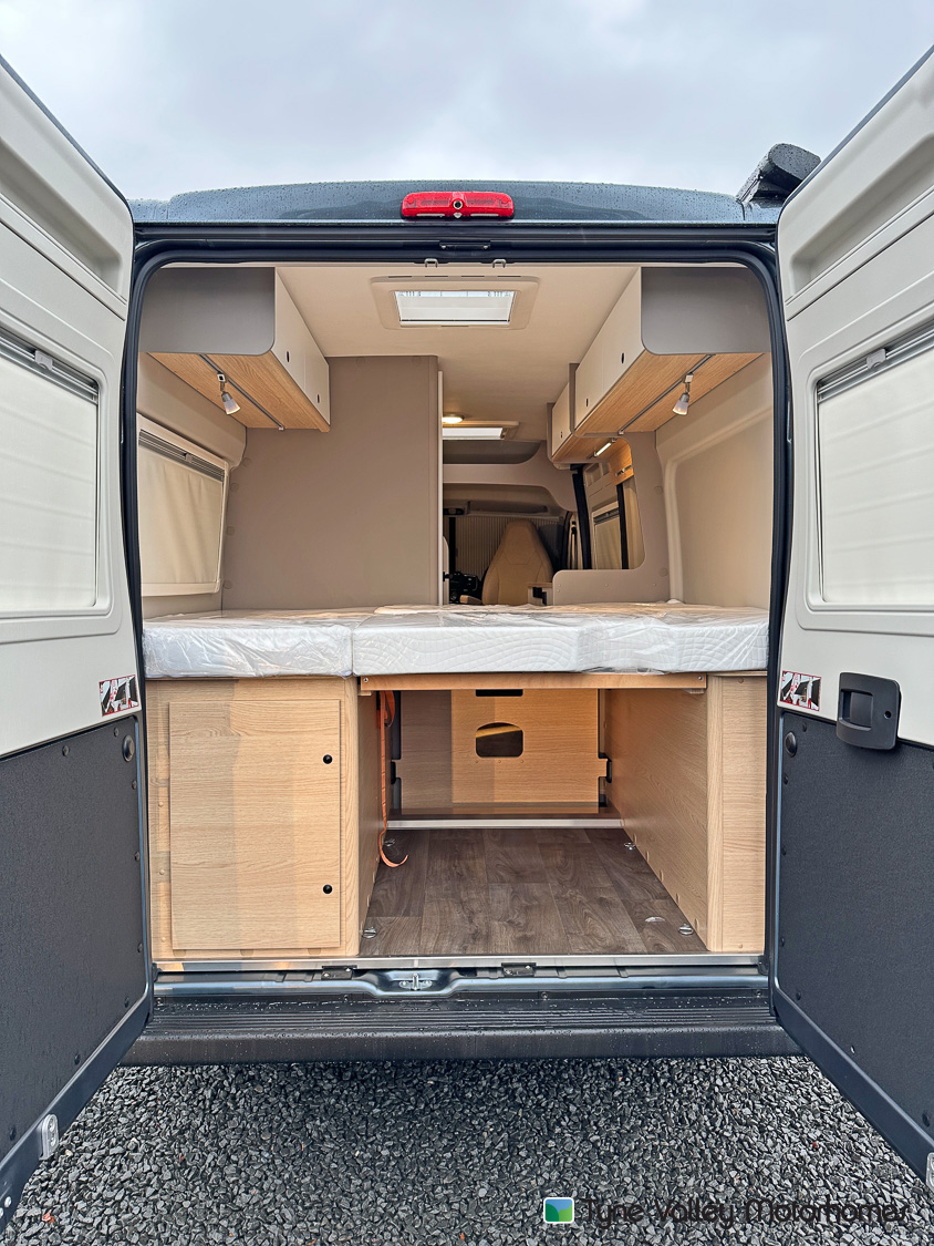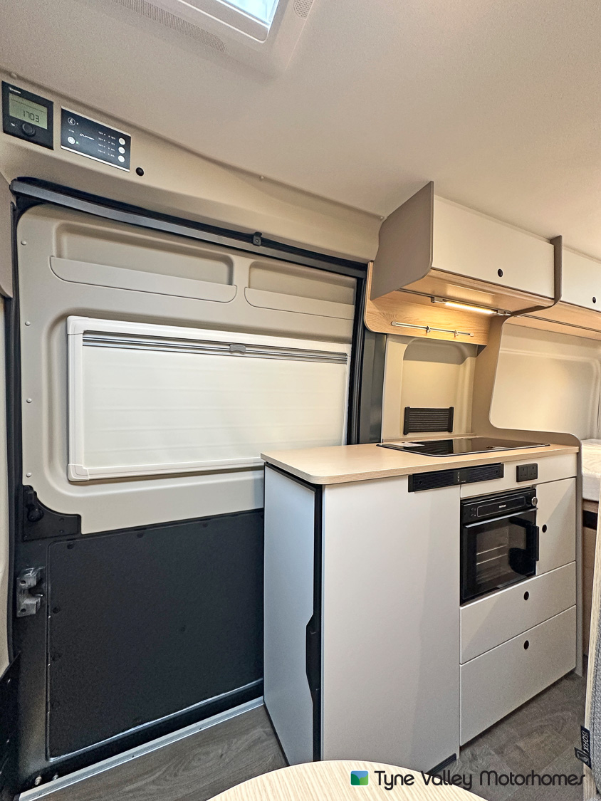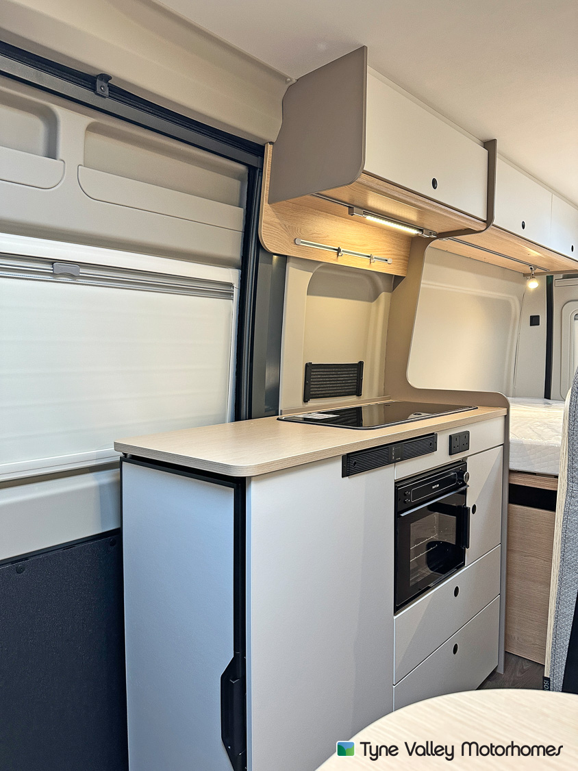 Inside, the rear of the van features a transverse double bed, offering a great night’s sleep wherever you are. There’s plentiful storage beneath the bed, and can be lifted to accommodate larger or bulkier items when you need the extra space. This clever design balances comfort with practicality, making it ideal for both weekends away and extended touring.