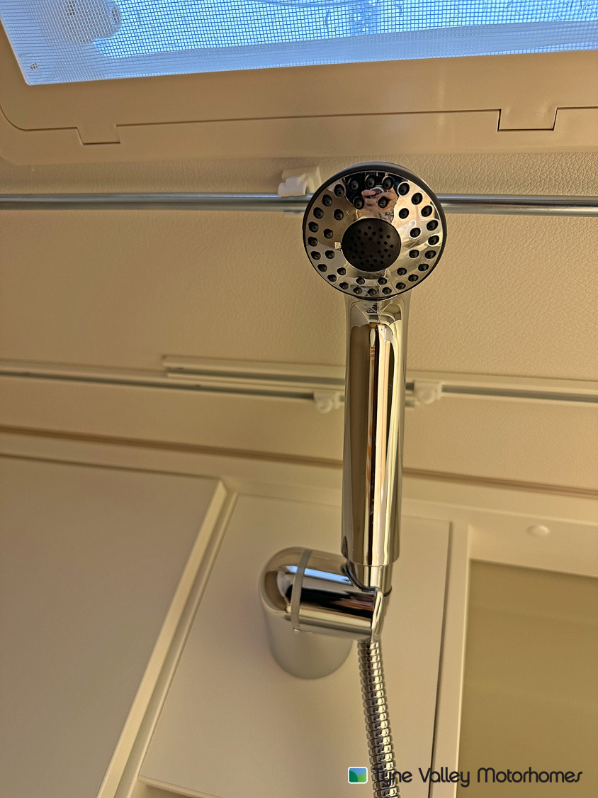 The well-equipped side kitchen gives you everything required for cooking on the go. With a 2-burner hob, sink, large compressor fridge, and a built-in oven, preparing meals feels straightforward and enjoyable. Opposite the kitchen, a spacious washroom provides true independence on your travels. It includes a washbasin, cassette toilet, and a pull-around curtain that transforms the space into a dedicated shower cubicle—ideal for off-grid adventures.