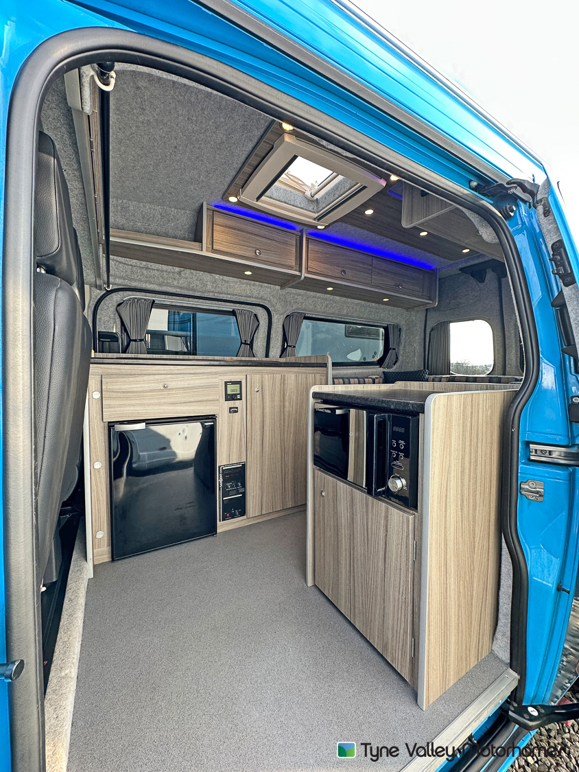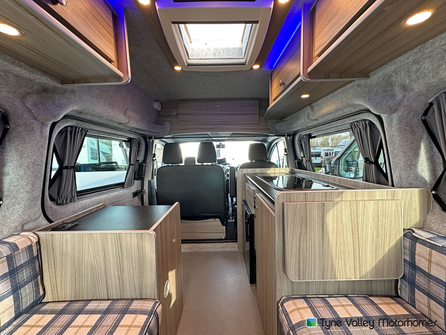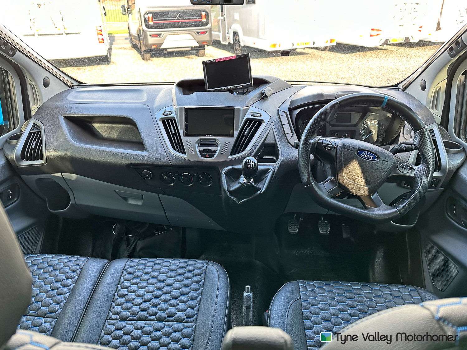 This stunning Ford Custom Campervan is built on a long wheel base chassis and comes with a 2.2 L 125 BHP engine coupled to a 6-speed manual gearbox. This campervan comes with cab air conditioning, Grunding media unit with DAB radio, smartphone connectivity, Bluetooth and there is o separate screen for your reversing camera, to make all those parking maneuvers a easy. The habitation area comes with o rear lounge that converts into a double bed when required, o well appointed kitchen with sink, 2-burner hob, a larger than average fridge with freezer comportment. and a microwave oven. LED light throughout give this campervan o great vibe. Features include USB points, removable table, microwave, Porta-Potty removable toilet, reversing camera and sensors, Truma heating, solar panel, leisure battery, Refillable Gas system, Electric hook-up point. external shower and black alloy wheels.